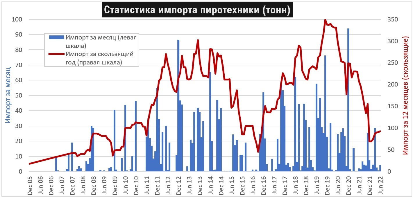 (update) Я нашел данные по импорту пиротехники в Армению за последние почти 20 лет, включая помесячные данные. Они представлены на графике ниже, в тоннах. Мы видим, что начиная с 2011 года средний объем импорта пиротехники в год составлял около 200-350 тысяч тонн с исключением на кризисный 2015 год, когда девальвировался драм (в декабре 2014 года) и резкий спад, в 3-4 раза мы видим уже после азербайджанской агрессии 2020 года. Учитывая это, на складах в среднем просто не могло быть очень много пиротехники. В то же время, делать выводы о конкретном складе при этом тоже нельзя – возможно именно этот склад обладал конкурентными преимуществами и при падении других рос сам. Кстати, основной импорт в каждом году имел место в ноябре-декабре (к новому году), когда импортировалось примерно половина годового объема и иногда в – июне. В этом июне импорт тоже был минимальным.