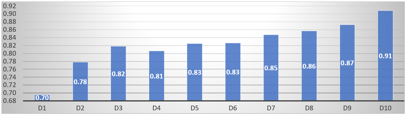 График 10. Распределение воспринимаемого уровня достатка относительно реального уровня достатка (1=средний, 0.2=крайняя нужда, 2=богатство), по децилям, в 2020 году