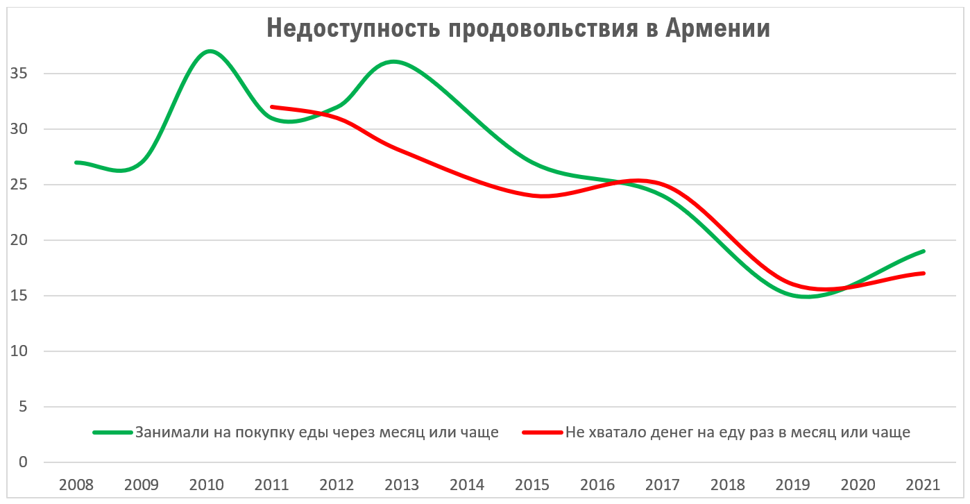 Другой подход к построению субъективной оценки бедности – оросить респондентов по поводу тех аспектов их жизни, которые уверенно сигнализируют о наличии или отсутствии бедности в данном случае. В опросе «Кавказский Барометр» (CRRC) регулярно задают вопросы относительно уровня жизни, в том числе способности купить еду. Так, в 2021 году 17% заявили, что им не хватало средств на покупку еду раз в месяц или чаще, а также 19% заявили, что одалживали деньги для того, чтобы купить еду (раз в неделю, раз в месяц или через месяц).