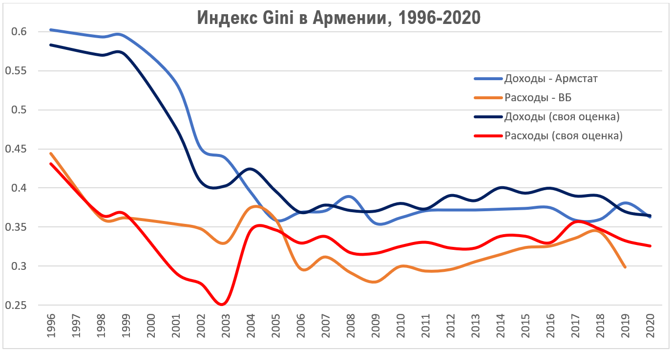 Для рассмотрения динамики уровня неравенства, можно взглянуть на индекс Gini в Армении. Есть официальные оценки индекса Gini по доходам, есть также оценка индекса Gini по потреблению, составленная Всемирным банком. Я также рассчитал индекс Gini как по потреблению, так и по доходам, индексы почему-то несколько отличаются от официальных. Возможно, дело в том, что я опирался на распределение по 10%-ным группам, а ВБ – на 1%-ные группы, Армстат же вовсе имел возможность строить распределение на основе всех домохозяйств. Но оценка Армстата в прошлые годы неоднократно пересматривалась, так что и там без проблем не обошлось.