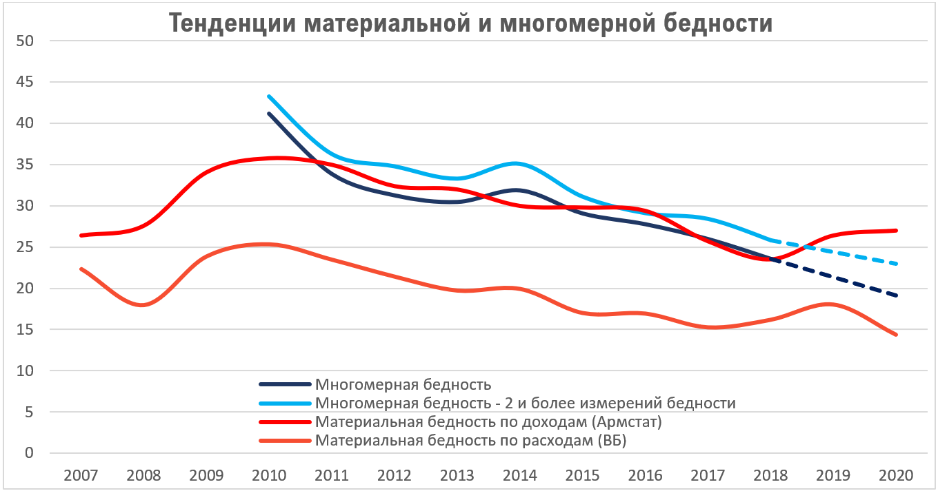 Как мы видим, неравенство в Армении остается высоким и недооценивается обществом. В то же время уровень бедности медленно растет, следуя за экономическим ростом. Однако в последние годы часть населения вышла из бедности, что особенно заметно по улучшению жилищных условий и других условий окружающей среды: многомерная бедность населения выросла с 41% в 2010 году до 19% в 2020 году.