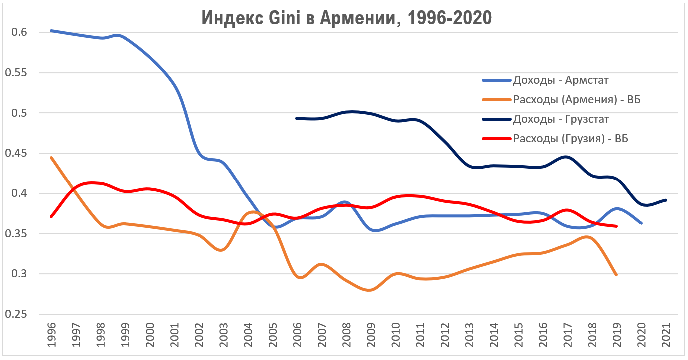 Как мы видим, по доходам индекс Gini составляет около 0.37. Это близко к показателям, к примеру, США или России, ниже уровня неравенства в Латинской Америке, но выше, чем в европейских странах. Кстати, в позднесоветский период рассчитанный индекс Gini в Армении составлял от 0.25 до 0.28. Опять же есть смысл сравнить показатели с Грузией. Из этого сравнения мы увидим, что уровень неравенства в Грузии существенно выше, чем в Армении и, хотя в последние 10 лет он сокращался, он все еще выше. Это объясняет сравнительно большую долю бедных в Грузии по сравнению с Арменией. Характерно, что в период правления Саакашвили уровень неравенства лишь вырос, а уровень бедности оставался стабильным. В Грузии антисоциальные реформы начали реализовывать сразу же и очень жестко, что привело к резкому расслоению населения.