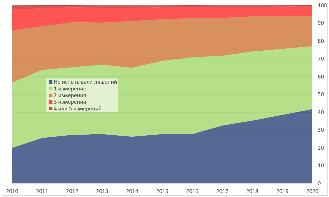 В последние годы помимо денежной бедности, в Армении оценивают и абсолютную депривацию (лишение) в ряде сфер. Лишь один ее аспект является завязан на финансовое благополучие. Другой аспект касается жилищных условий. За год, между 2019 и 2020 годами, доля домашних хозяйств, не имеющих адекватных жилищных условий сократилась с 15.4% до 11.5%. Другие сферы лишений – образование, труд и здоровье. Если хотя бы в двух из пяти компонентов опрошенные испытывали лишения в течение квартала и более, то их относили к бедным с точки зрения условий жизни. Вот как выглядит тенденция с 2010 года.