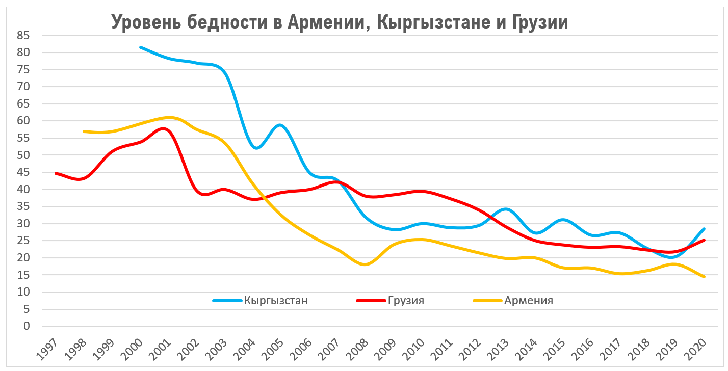 Несмотря на отдельные отличия в траектории, на сегодняшний день три выбранные страны очень близки по уровню бедности, хотя в Армении он все же несколько ниже. Также можно отметить высокий уровень бедности в Грузии, вызванный безработицей и развалом сельского хозяйства.