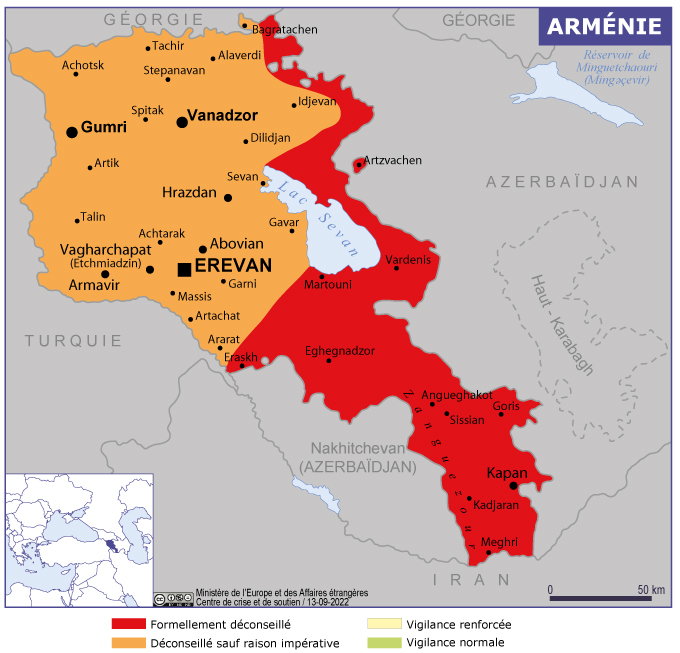Похожее сообщение было распространено МИД Франции несколькими днями ранее – 20 сентября. Там зоны риска отмечены несколько шире и включают в себя более обширные части территории Вайоц-Дзора и Арарата.