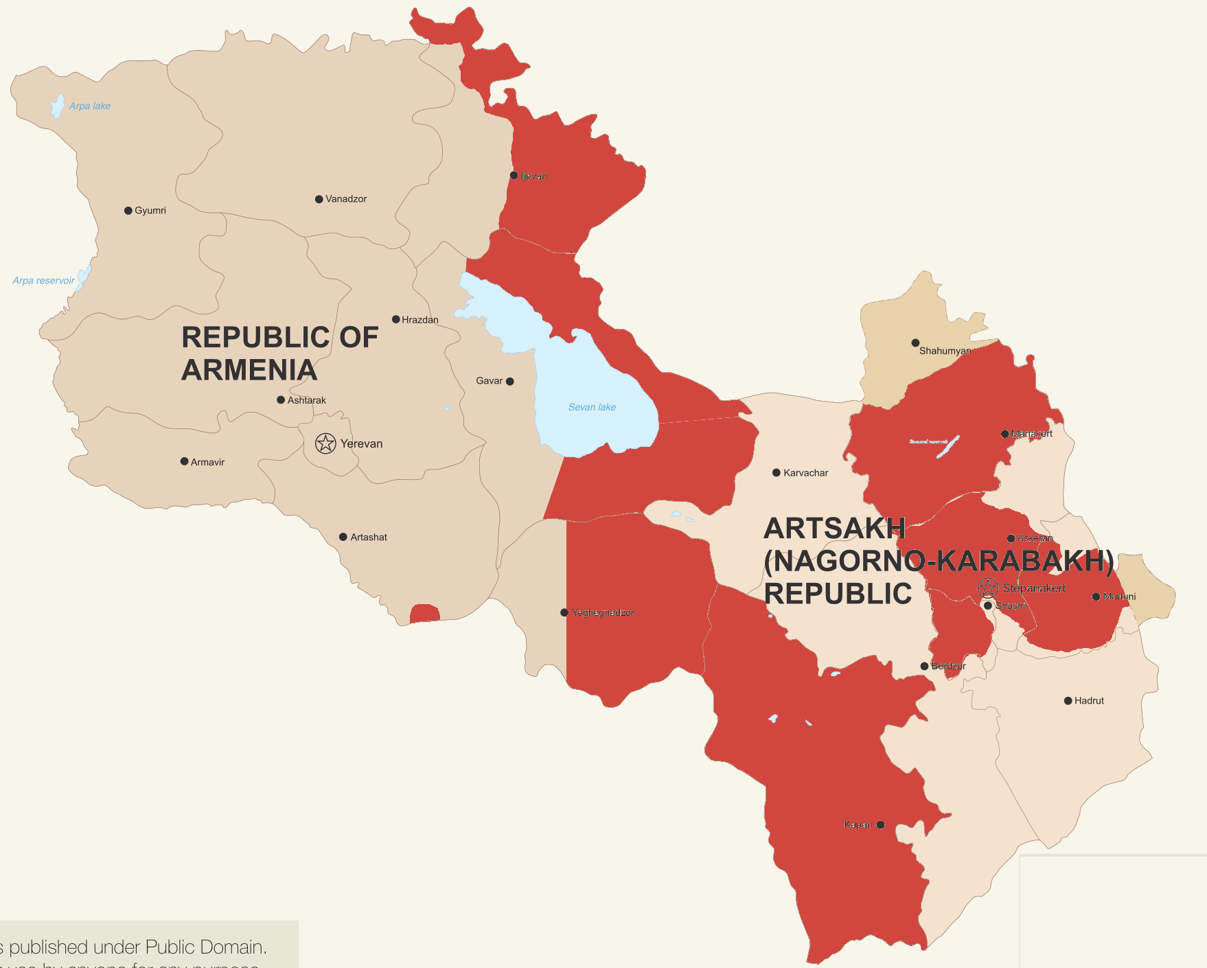 На основании этого описания я составил карту регионов, которые не рекомендуются к посещению, эти территории отмечены светло-коричневым цветом. Также, посольство США призвало Азербайджан отвести силы на исходные позиции. Карта представлена ниже и в нее, как уже отмечалось в заявлении самого посольства, включен Нагорный Карабах в де-факто границах.