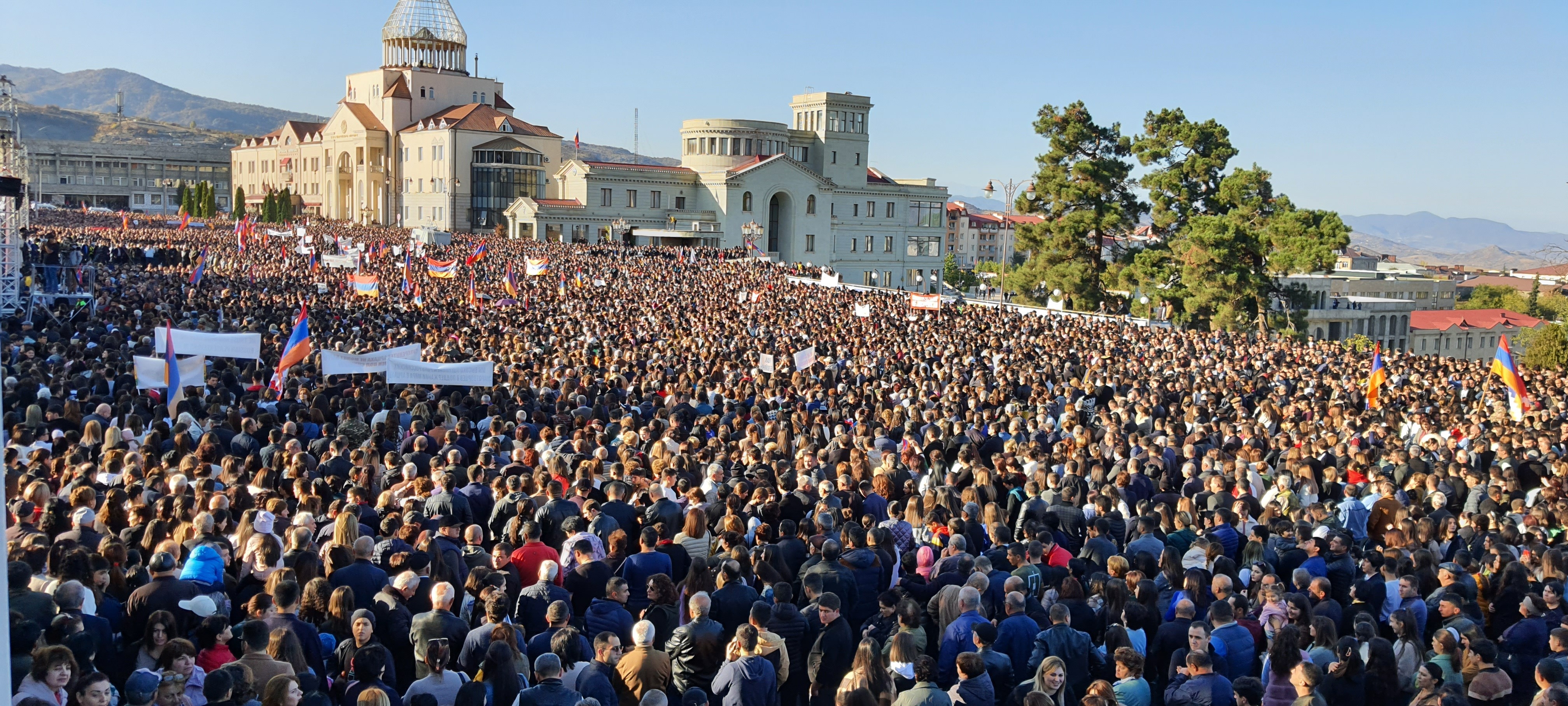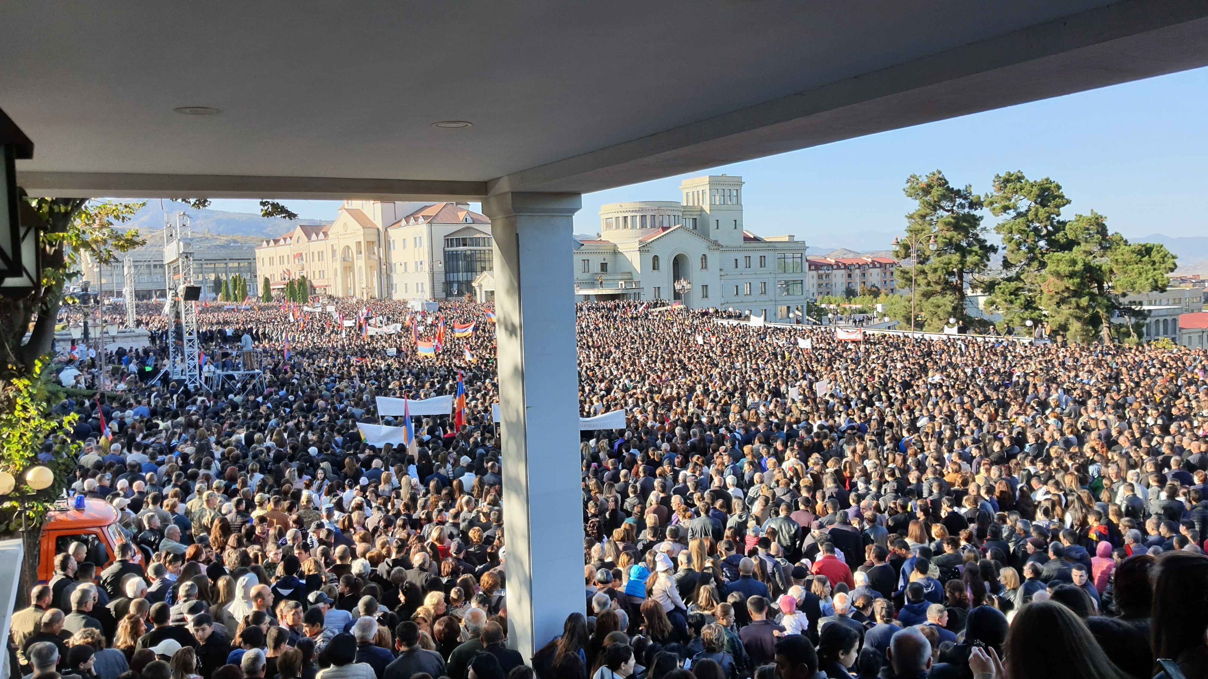 В конце октября в Степанакерте на пл. Возрождения состоялся митинг, который был организован совместно всеми партиями, представленными в парламенте Арцаха. На этом кажущемся появлении несколько тысяч человек с требованием статуса для Арцаха. Ниже представлю пару кадров вывезенных: