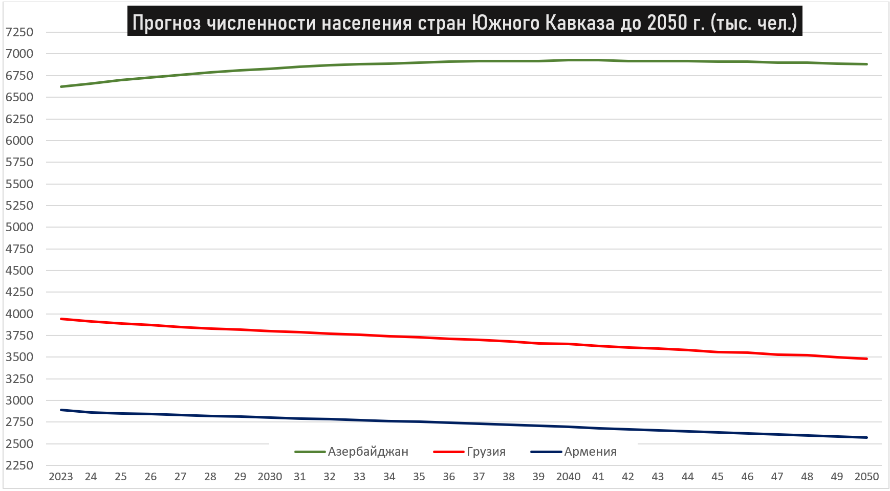 В отличие от Армении и Грузии, по Азербайджану вплоть до примерно 2040 года ожидается рост населения, после чего очень медленное сокращение. Поэтому, если сегодня на Азербайджан приходится 49.2% населения трех стран, то на 2035 это будет 51.6%, а на 2050 – 53.2%.