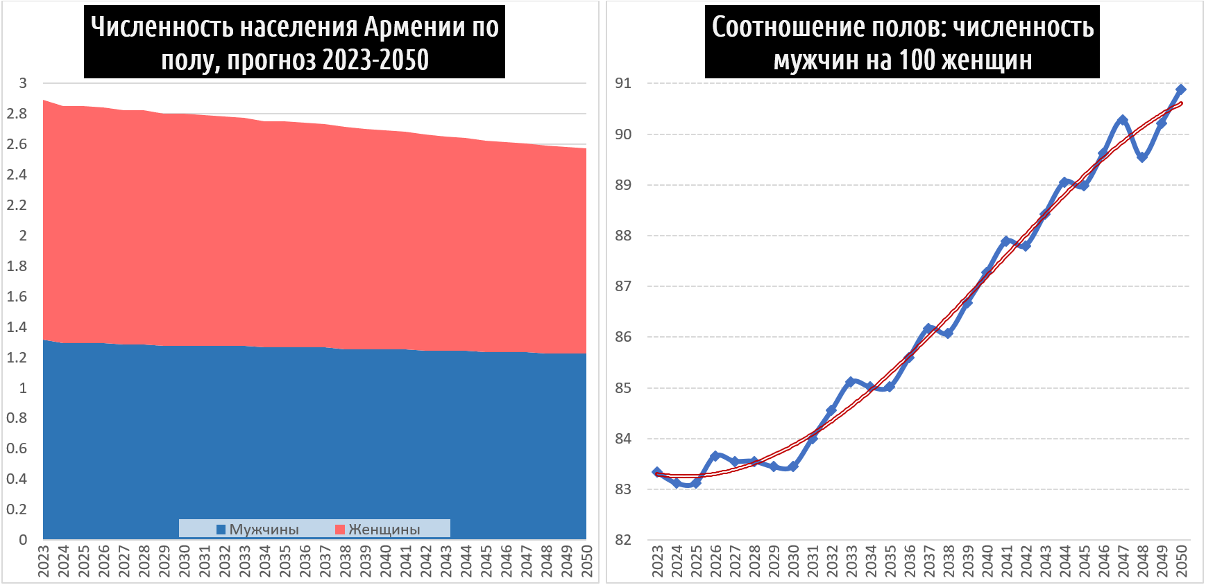 Однако и нынешнее состояние половой структуры населения не будет неизменным. Скорее всего, и разность в продолжительности жизни будет снижаться, и интенсивность эмиграции именно мужчин снизится. Наибольшая разница в продолжительности жизни между мужчинами и женщинами в пользу женщин характерна для постсоветских стран, а наименьшая – для стран Ближнего Востока. Что же касается миграции, то ввиду уже сложившейся диспропорции полов, женщины тоже стали чаще мигрировать, в том числе с брачными целями. Кроме того, растет уровень экономической активности женщин, что приводит к выравниванию картины миграции, а трудовая миграция как явление, где мужчины едут на север для занятия тяжелым физическим трудом, постепенно становится все менее выраженной и уходит в прошлое, в том числе и ввиду экономических изменений в России. Поэтому, я ожидаю, что в ближайшие десятилетия снизится общая интенсивность миграции, но при этом женщины, возможно, станут мигрировать чаще, чем мужчины. Это уже произошло в Грузии, и, вероятнее всего, произойдет в Армении.