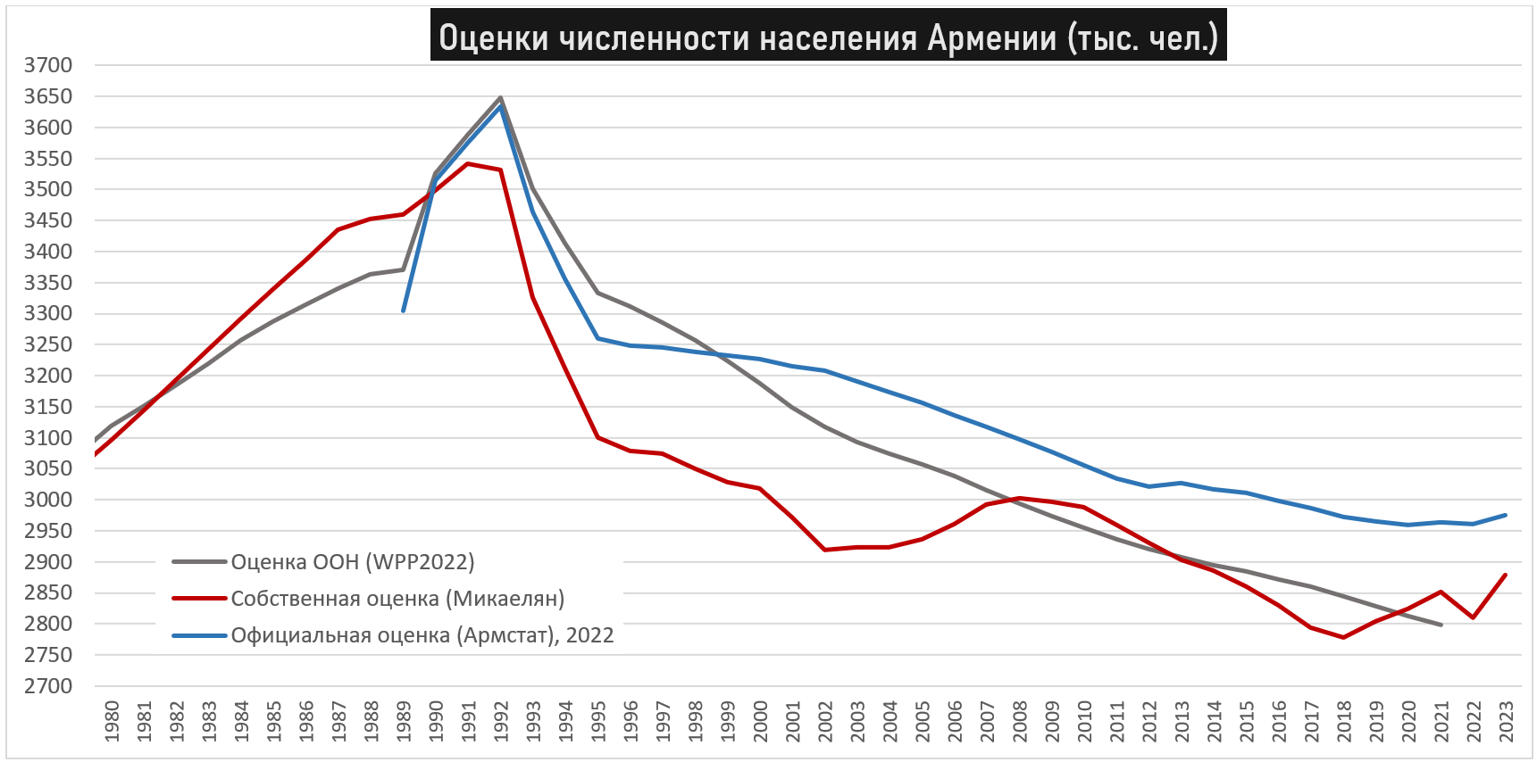 Как мы видим, во всех прогнозах ООН относительно Армении за последние 20 лет (на графике не приведены прогнозы середины-конца нулевых, чтобы его не перегружать) предполагалось поэтапное снижение населения, постепенно ускоряющееся к IV десятилетию XXI века. Однако наиболее резкое падение предполагалось по прогнозу 2002 года (есть только две точки – за 2025 и 2050 гг.). Относительные демографические успехи Армении в дальнейшем повлияли на то, что в дальнейшем предполагалась более благоприятная динамика, а по прогнозу 2019 года предполагался даже рост вплоть до 2030 года. Но в тех прогнозах было очень много неточностей в исходных положениях и, хотя в деталях и нынешний прогноз ООН содержит много неточностей, но они друг друга компенсируют таким образом, что расхождения с моим прогнозом (более детально учитывающим обстоятельства Армении) стали минимальными.