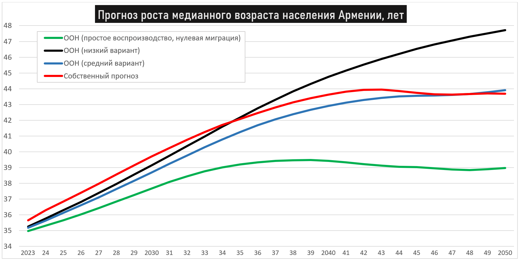 Процесс старения населения лучше всего характеризуется изменением среднего и медианного возраста населения. Если в 1971 году медианный возраст населения Армении составлял (по оценкам ООН) 20.1 год, то к 1991 году он достиг 25.9 лет, а к 2021 – 34.4 лет. Медианный возраст – возраст, относительно которого населения делится на две равные части: половина моложе этого возраста, а половина – старше. Медианный возраст отличается от среднего возраста, но тенденции изменения обоих показателей одинаковы. Медианный возраст продолжит расти и в дальнейшем, хотя темпы роста отличаются в зависимости от сценария.