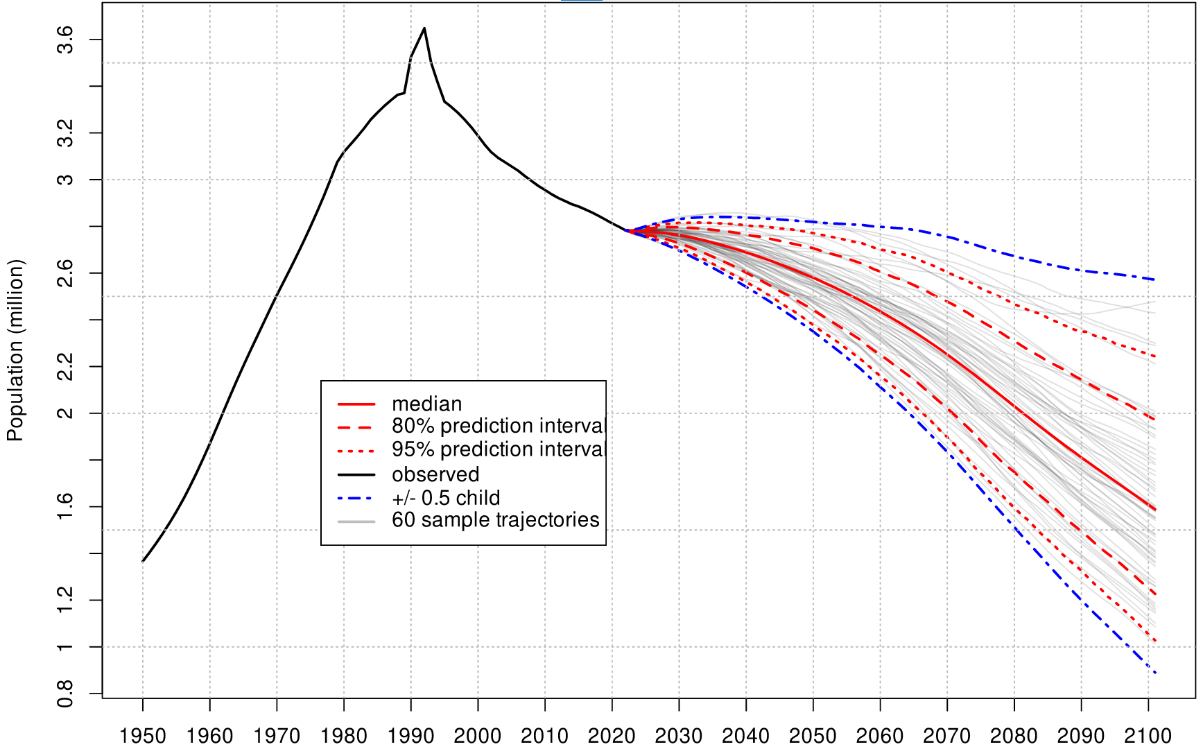 Согласно моему прогнозу, смертность превысит рождаемость в 2032 году, что можно считать позитивным сценарием, поскольку в целом консенсус демографов состоял в том, что это произойдет в 2027 году. Но после 2032 года никогда на обозримую перспективу рождаемость уже не превысит смертность, и естественная убыль примет постоянный, системный характер, сокращая население примерно на 5 тысяч в год вплоть до 2050 года. Добавим к этому эмиграцию – и получим ежегодную депопуляцию примерно в 12 тысяч человек в год (хотя, понятно, что в отдельные годы миграция может составлять как положительную величину, так и расти в разы).