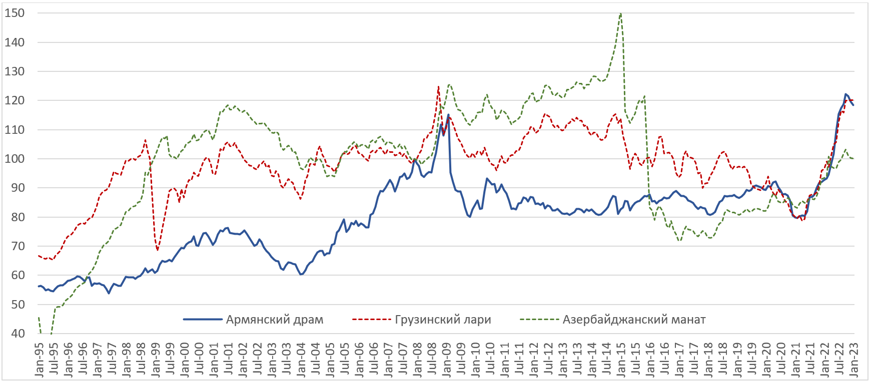 Как мы видим, сегодня драм исторически самый дорогой в относительном выражении, за полтора года он прибавил в стоимости более трети. В 2022 году подорожали и лари с манатом, причем колебания лари почти 1 в 1 совпадают с драмом. Скорость ревальвации как драма, так и маната, одна из самых высоких в мире. Это, в свою очередь, создает множественные риски для местного производства и экспортоориентированных отраслей – и в целом риски развития «голландской болезни».