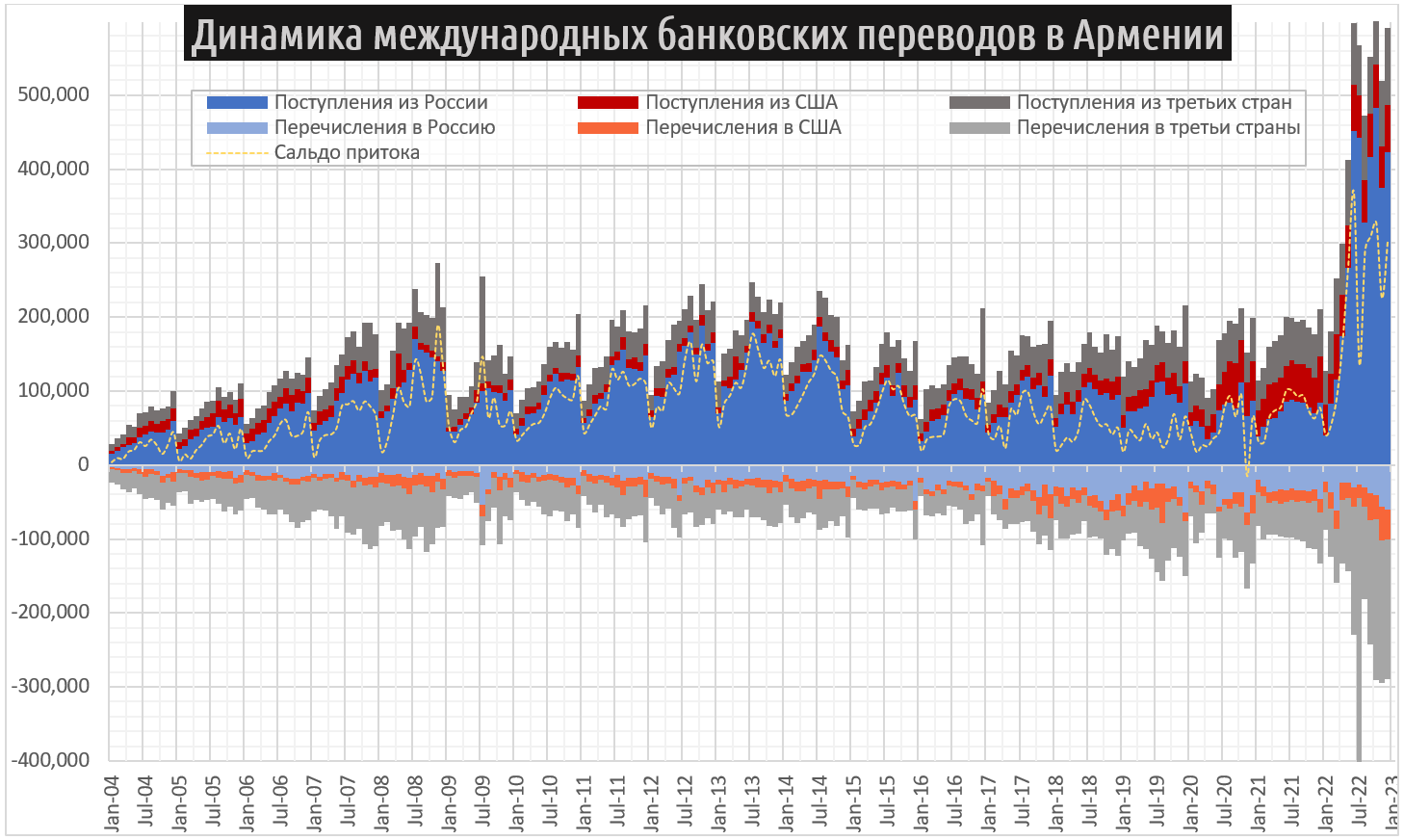 Если в среднем в 2007-2021 гг. в месяц в Армению поступало 158 млн долл. денежных переводов, то в 2022 году – 432.5 млн.; перечисления из Армении в среднем составляли 82 млн долл. в месяц, а в 2022 году – 217.2; сальдо притока в среднем составляло 76 млн долл. в предыдущие годы и 215.3 млн долл. в 2022 году.