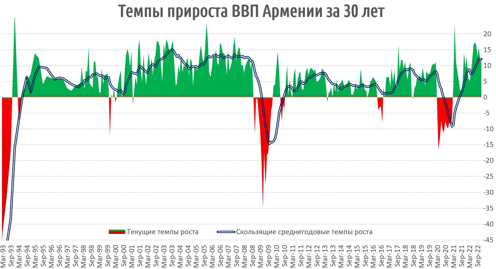 Примечание по содержанию: обратите внимание на то, что за рассматриваемый период было три крупных кризиса – трансформационный спад первой половины 1990-ых, глобальный экономический кризис 2008/9 гг. и кризис 2020 года, связанный с ковидом, карантином и азербайджанской агрессией против Арцаха. Периоды роста в значительной мере связаны с компенсацией предшествующего спада.