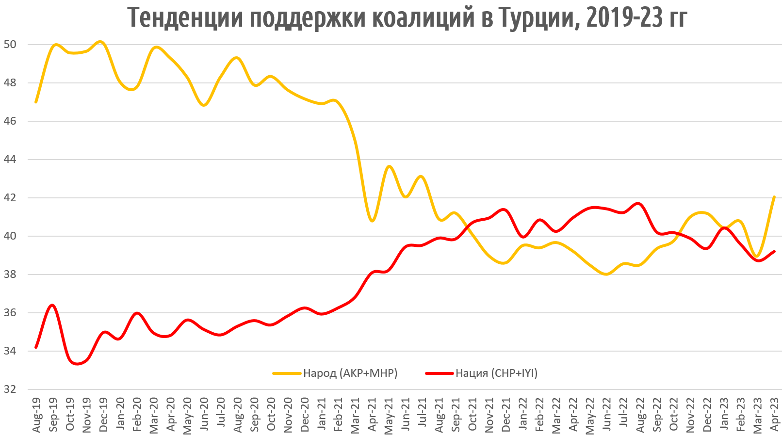Для большей наглядности в понимании тенденций электоральных рейтингов Турции, взглянем на тенденцию рейтингов по коалициям, где упрощенно рассмотрим только AKP+MHP vs CHP+IYI. Эти тенденции также могут быть использованы как прокси для результатов президентских выборов (с тем учетом, что оппозиционный альянс постепенно расширяется, включая в себя новые миноритарные партии).