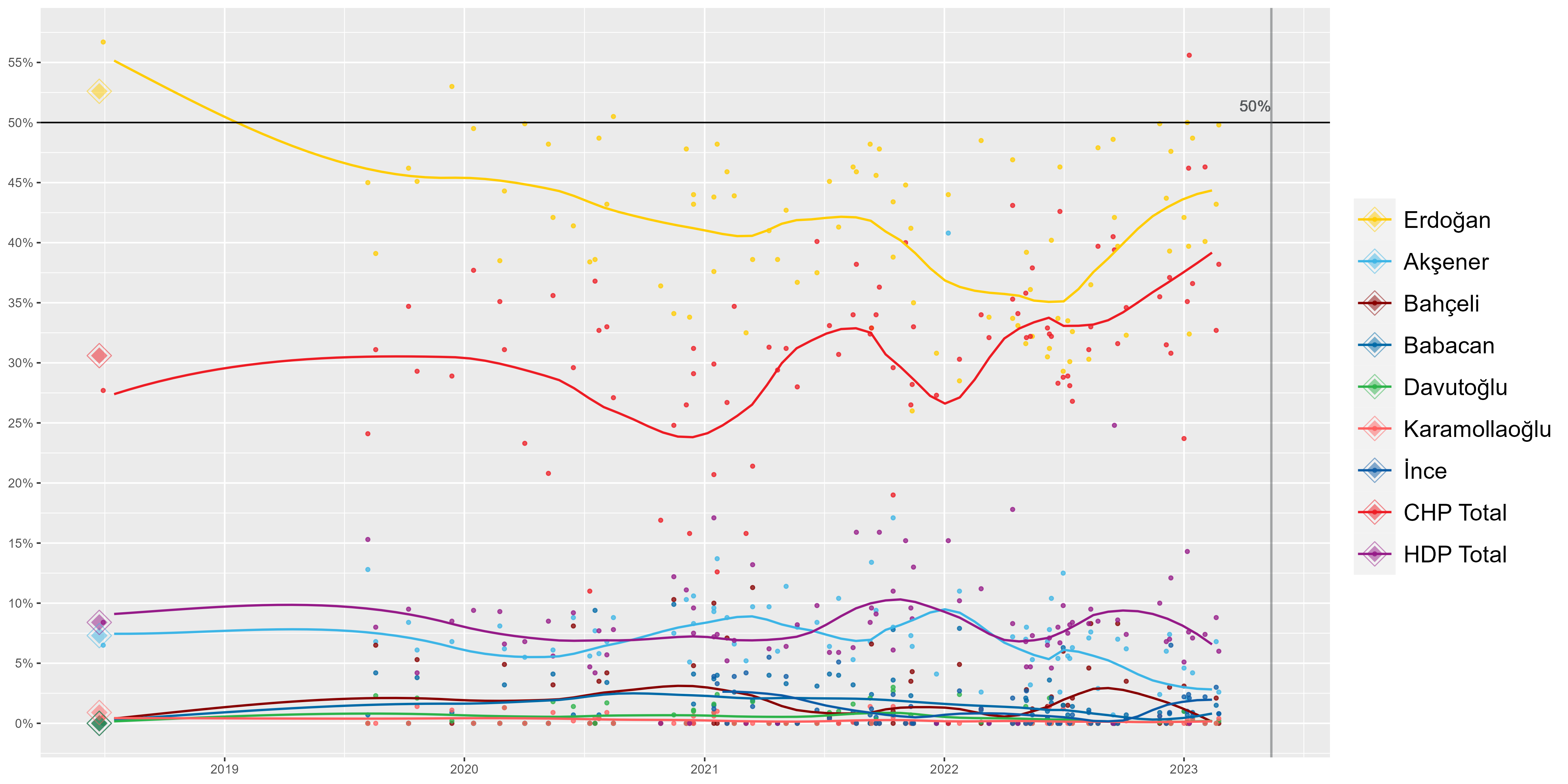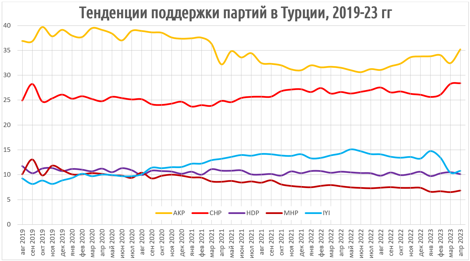 Вышеприведенная динамика поддержки партий за 4 года показывает, что рейтинги партий в Турции довольно стабильны, но долгосрочно Эрдоган терял популярность вплоть до середины 2022 года, когда она начала медленно восстанавливаться. Возможно, это вызвано политикой низкого вовлечения в украинский конфликт, либо снижением инфляции или другими причинами.