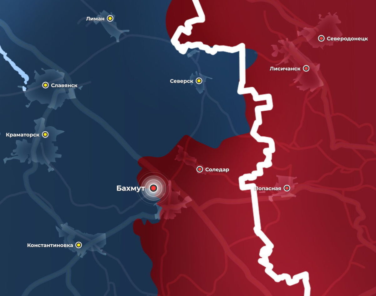 Карта mash.ru. Бахмут взят, как и Соледар ранее. Однако, Константиновка, Дружковка, Часов Яр и Северск, которые также россияне пытались взять в 2022-23 гг., остаются под контролем Украины, а Славянск и Краматорск практически являются тылом.