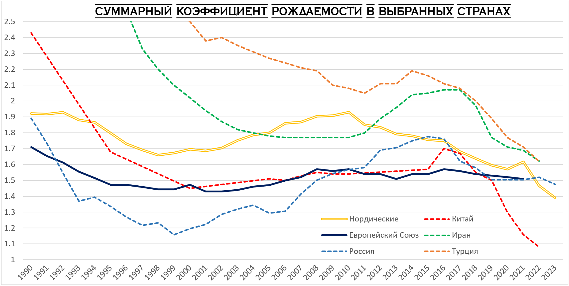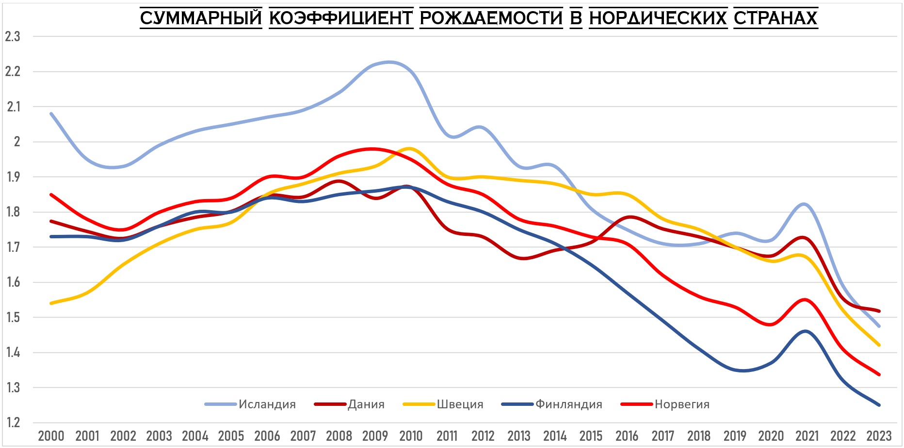 Итак, на данный момент уже почти уверенно можно говорить о том, что «скандинавской» или «нордической» модели успешного сохранения рождаемости на приемлемом уровне при высоком уровне жизни нет. При этом, еще сравнительно недавно существовали дебаты относительно восстановления уровня рождаемости в развитых странах и именно нордические страны выступали в качестве альтернативы. Однако чуда не случилось: альтернативные социальные практики, насаждаемые государством, снижение религиозности, пандемия и климатическая паника привели к снижению рождаемости в нордических странах.