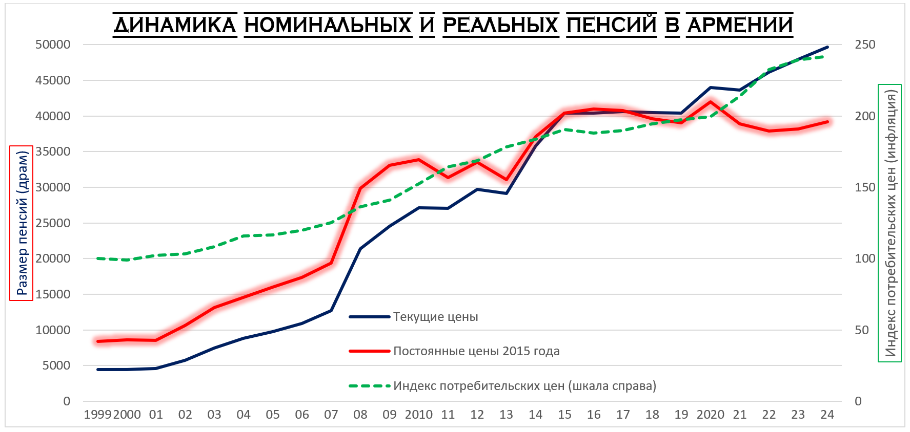 График 1. Рост пенсий с 1999 по 2024 гг. (средняя месячная пенсия за год, в драмах, в текущих ценах)