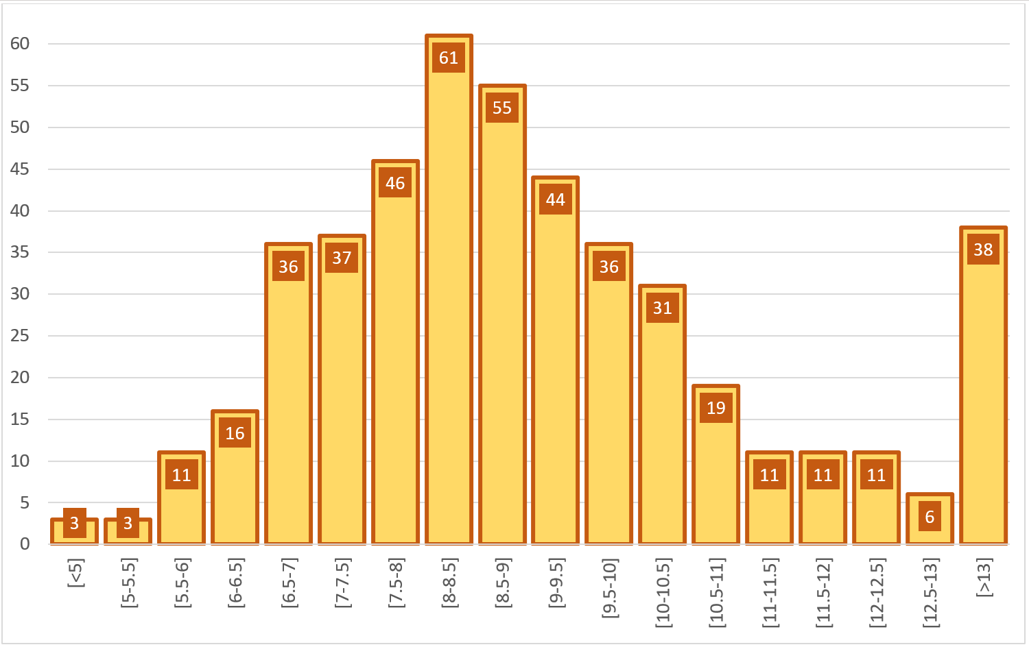 Если считать модой не интервал 8-8.5, а сразу два интервала 8-8.5 и 8.5-9, особенно, учитывая, что распределение симметрично именно вокруг их центра, то все равно в конце появляется заметный хвост, тем более, что есть основания предполагать, что избыток ложится на всю вторую половину, а не только на отдельные участки в правой части распределения. Чтобы было понятно, я сгруппировал все, что выпадает за 3 стандартных отклонения относительно модального интервала в центре, и таких участков вышло 38, т.е. при условии нормального распределения, в 38 участках вообще не могло быть зарегистрировано таких результатов, но и на участках начиная от 11.5% от списочного состава избирателей, результаты, скорее всего, завышены.