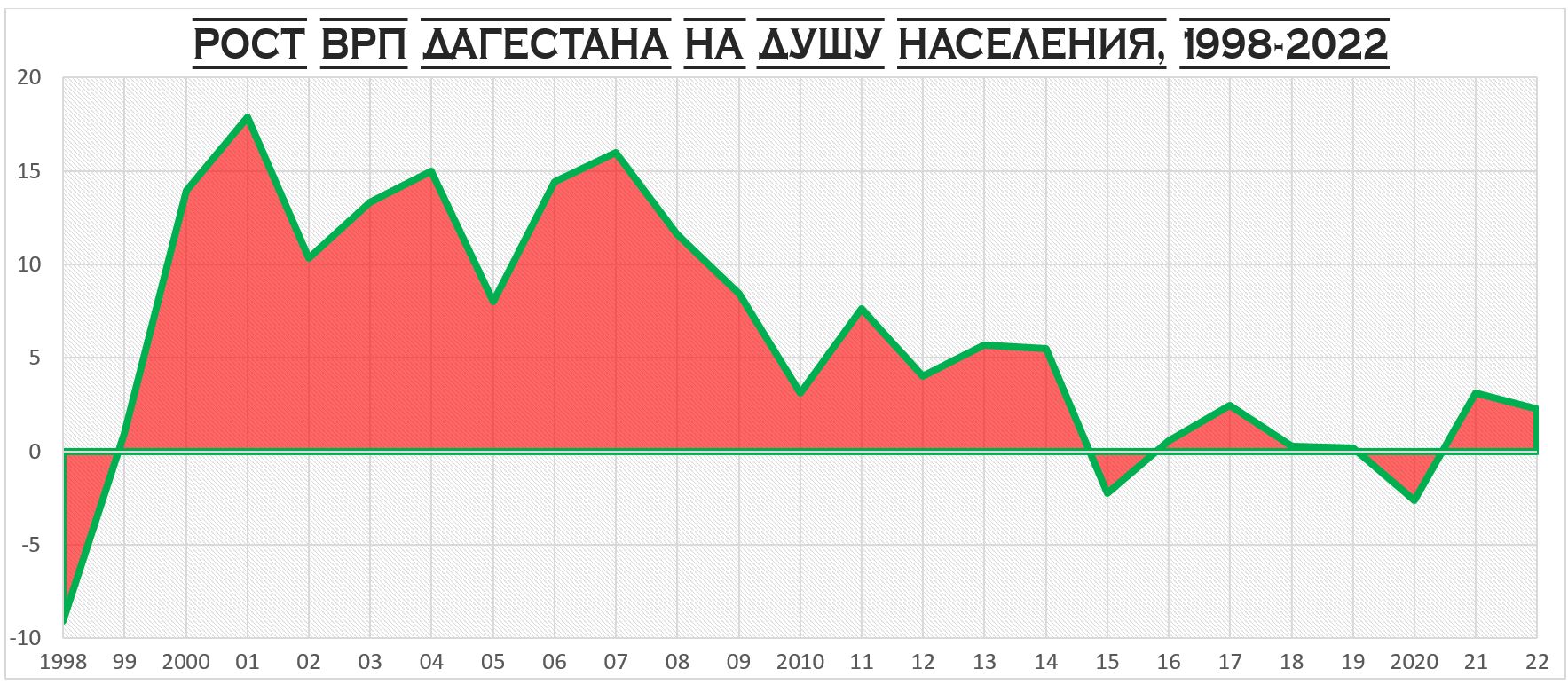Глядя с точки зрения политической экономии этих протестов, надо сначала обратить внимание на экономическую стагнацию в Дагестане (как, впрочем, и по всей России). Если до 2014 года (включительно) экономика росла, то с тех пор рост был минимальным. Так, суммарный рост валового регионального продукта Дагестана за 8 лет в период 2015-2022 гг. составил 10.5% или 1.3% годовых, а на душу населения рост составил 3.8% за 8 лет или 0.47% в год, поскольку само население растет.