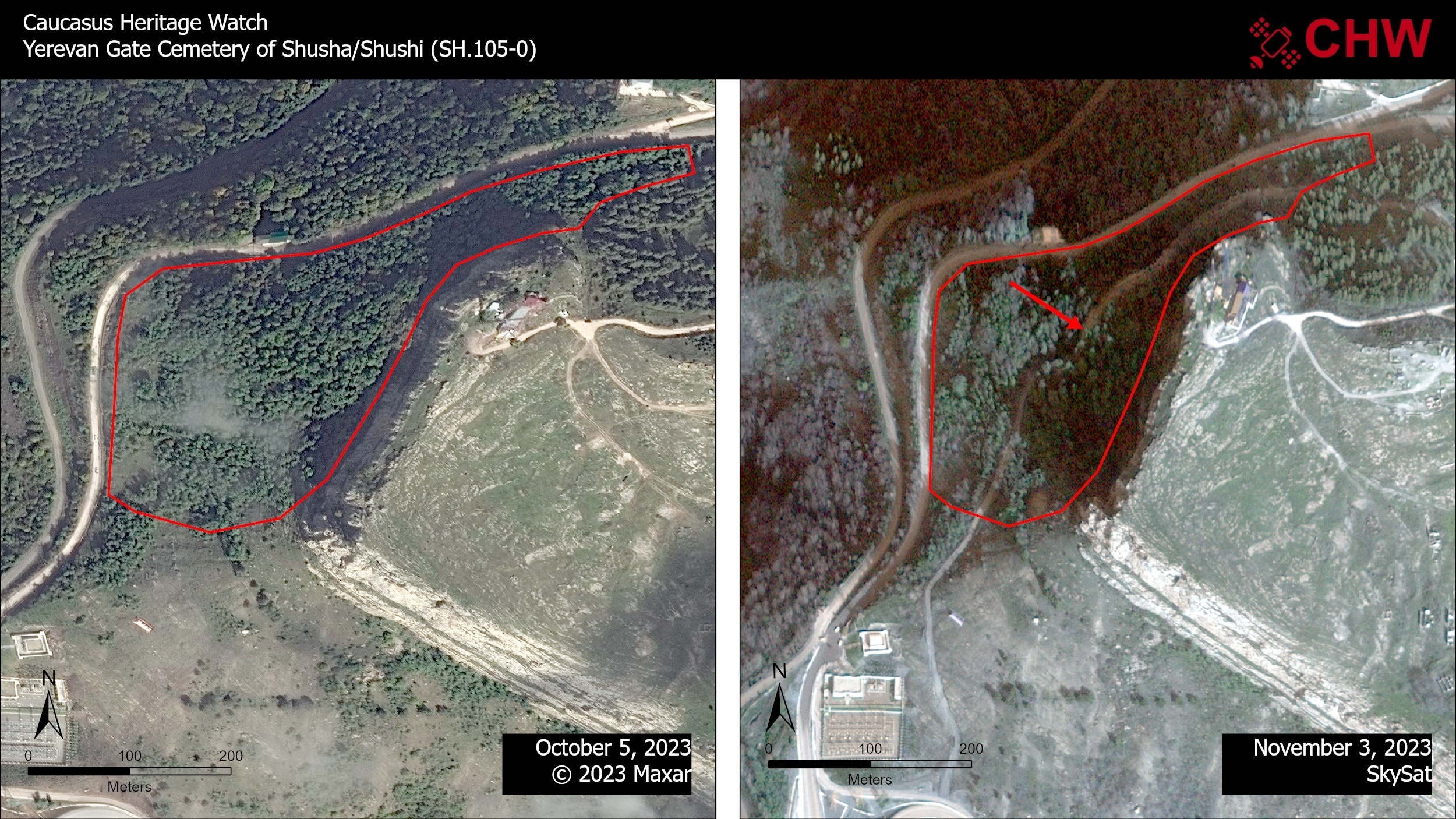 В период с 5 октября по 3 ноября 2023 года азербайджанцы начали прокладывать дорогу прямо через территорию исторического кладбища в Шуши, известного как кладбище у Ереванских ворот. Бульдозерами было повреждено или полностью уничтожено кладбище.