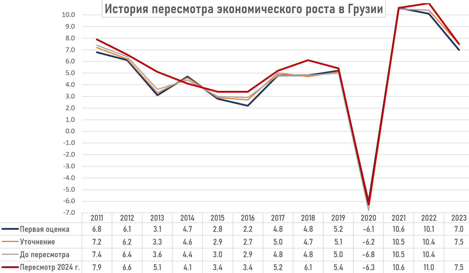 Недавно национальный статистический офис Грузии опубликовал статистику валового внутреннего продукта, пересмотренную для периода с 2010 по 2023 год. Рост ВВП охватывает период с 2011 по 2023. Практически за каждый год пересмотр был проведен в сторону повышения, причем нередко значительного. Вообще статистика Грузии регулярно пересматривает рост ВВП – так, изначально опубликованные цифры в дальнейшем подвергаются коррекции (опять же, повышению), но сейчас произошла дополнительная коррекция сразу для большого временного интервала.