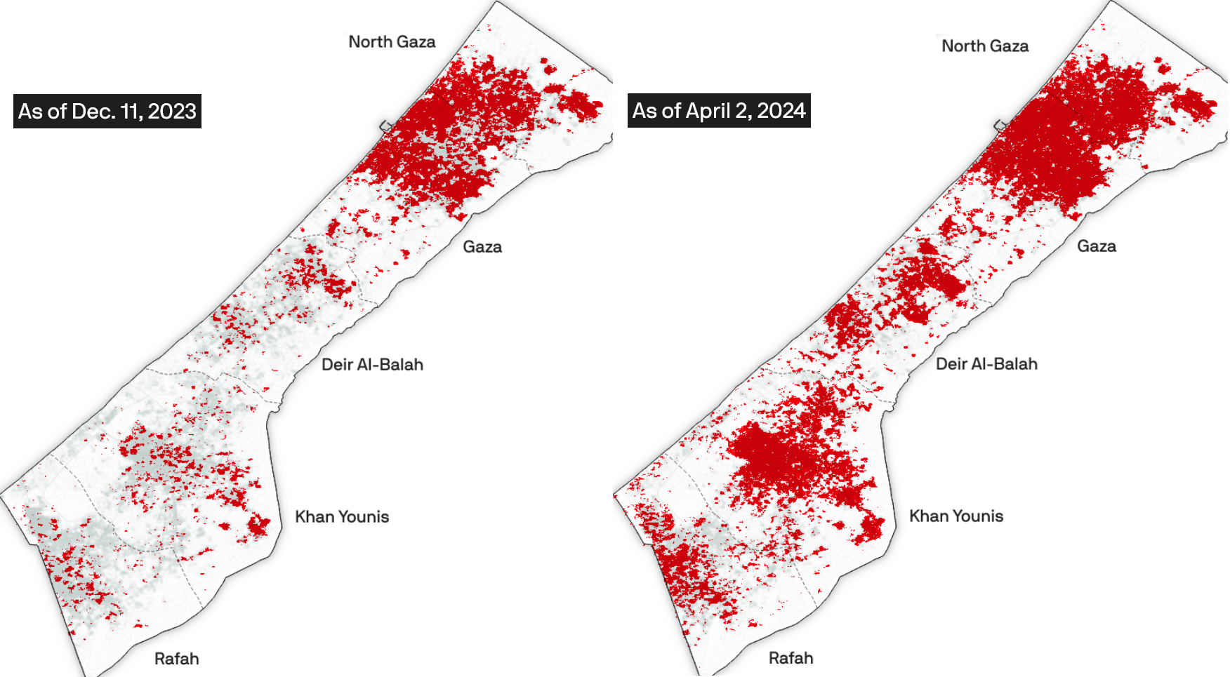 Вот так выглядит карта уничтоженного жилфонда сектора Газа (слева декабрь 2023 г. в сравнении с началом апреля 2024 г.)