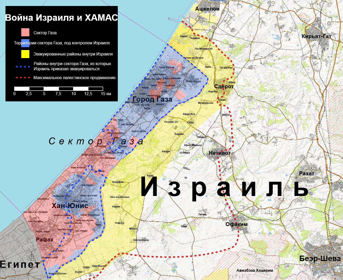 Карта боевых действий. Желтым цветом отмечена зона эвакуации в Израиле, красным – территории сектора Газы, где сохраняется палестинский контроль, а синим – территории сектора Газы, контролируемые Израилем.