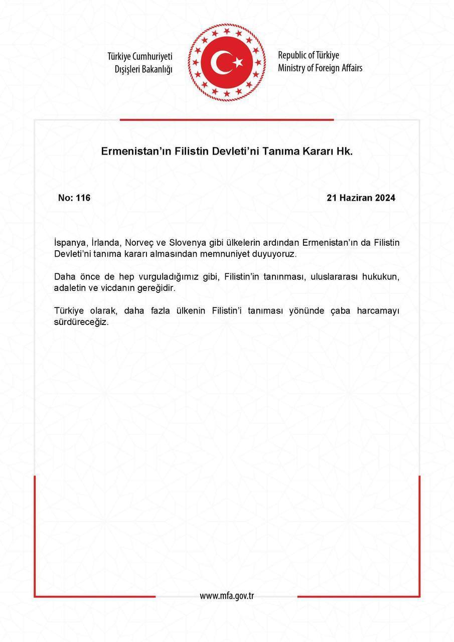 А вот случай с Турцией куда интереснее. 18 июня Пашинян провел с Эрдоганом телефонный разговор, где в числе прочего обсуждались последние тенденции в региональной и международной политике. Объявление о признании Палестины публикуется МИДом Армении 21 июня. Почти мгновенно МИД Турции публикует заявление: «Мы рады, что Армения, вслед за такими странами, как Испания, Ирландия, Норвегия и Словения, решила признать государство Палестина… Турция будет продолжать свои усилия, чтобы привлечь больше стран к признанию Палестины».