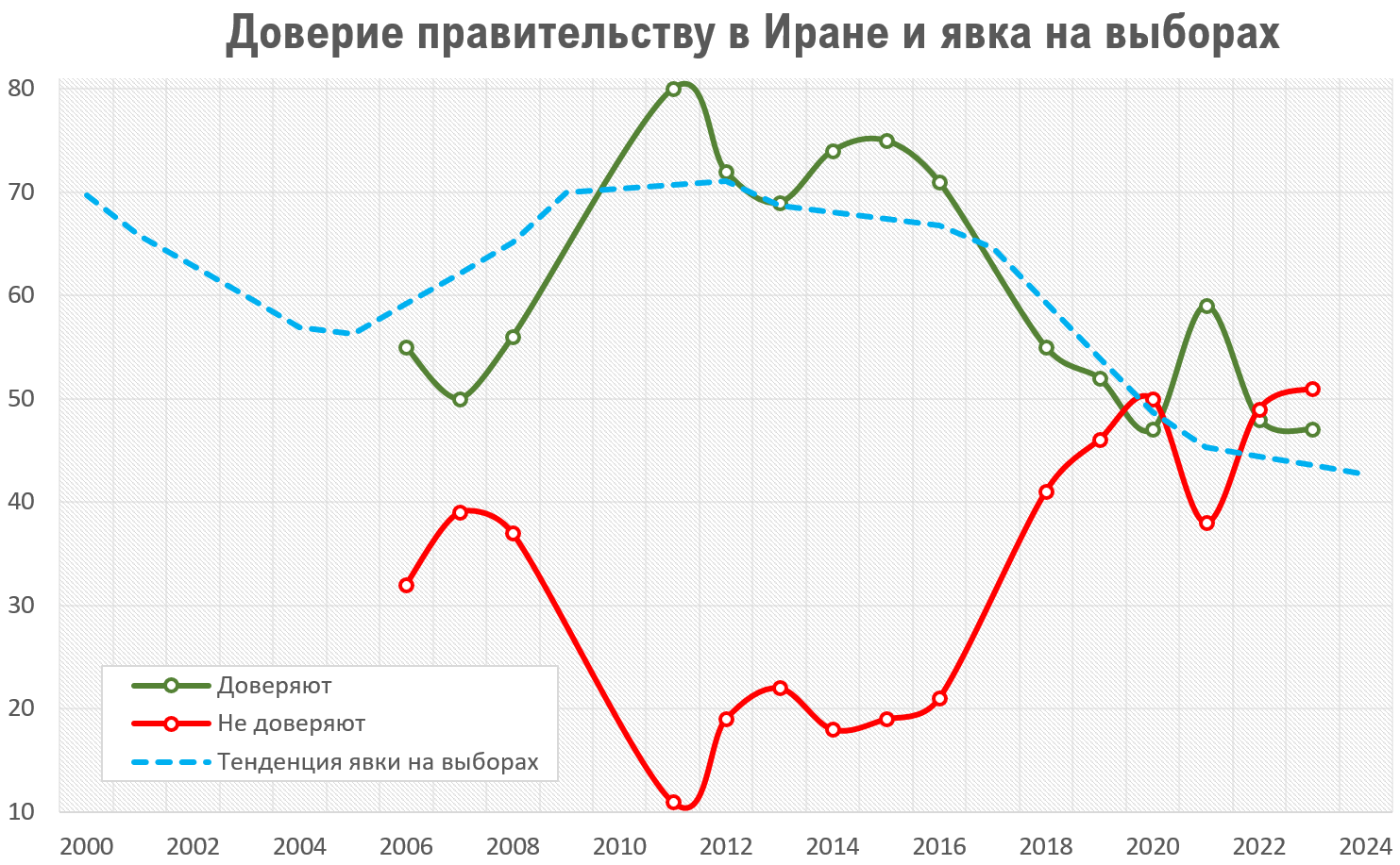Тяжелая экономическая ситуация, вкупе с ригидностью политической системы, подтачивает легитимность власти в Иране, что, в конечном счете и приводит, в том числе, к сниженной явке на выборах, росту эмиграции и более высокой готовности к протесту, несмотря на прошлые неудачи. Это сказывается и на доверии к правительству в Иране, которое в последние годы колеблется возле отметки в 50%. Более того, явка на выборах хорошо коррелирует с уровнем доверия правительству.