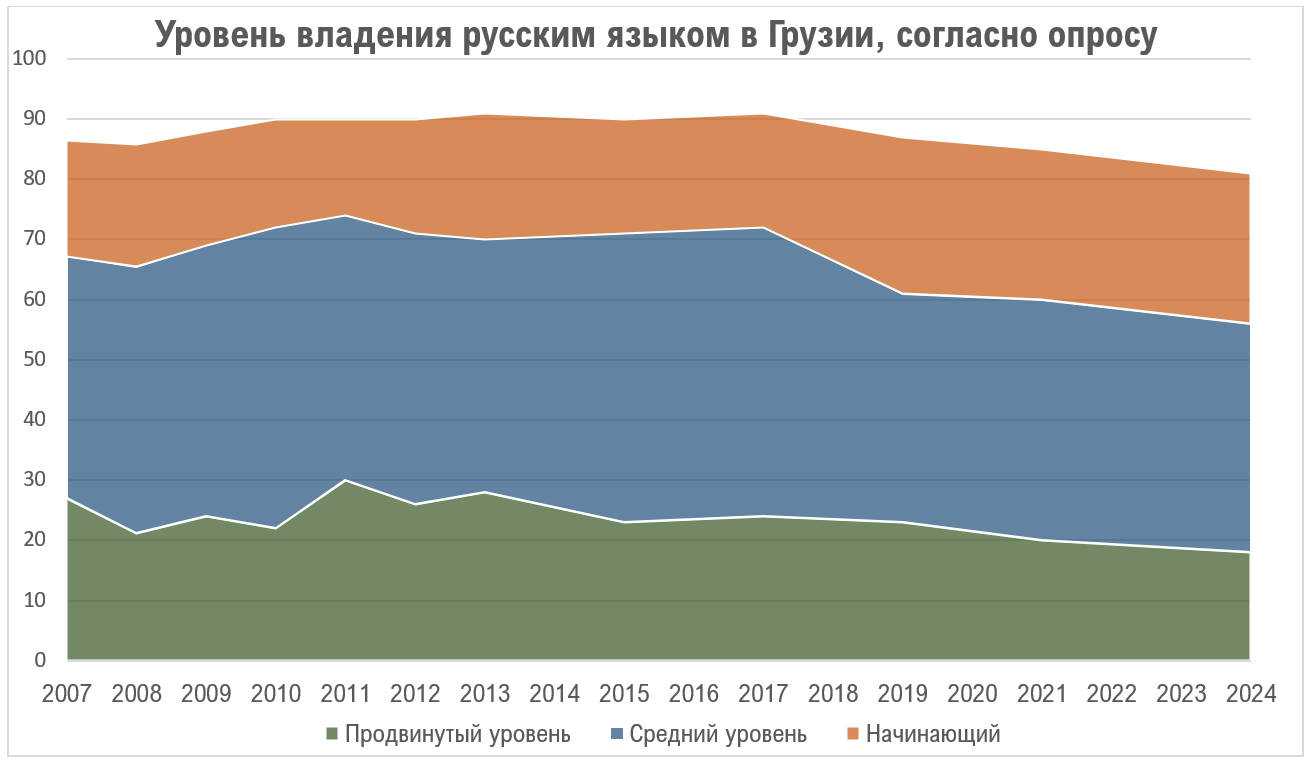 Как мы видим, существует тенденция снижения оцениваемого уровня знания русского языка в Грузии. Если исключить конфликтный 2008 год, когда опрос мог исказиться, то в период 2007-2013 гг. на уровне «продвинутый» владение русским заявили 26.2%, на уровне «средний» - 44.4%, а всего чуть более 70% владели русским языком. В период правления Саакашвили, в особенности, в 2009-12 гг. в школах заметно сократилось преподавание русского языка, что впоследствии сказалось и на уровне владения всем населением – к настоящему моменту эти цифры составили, как уже сказано, 18% и 38% (в сумме 56%) соответственно.