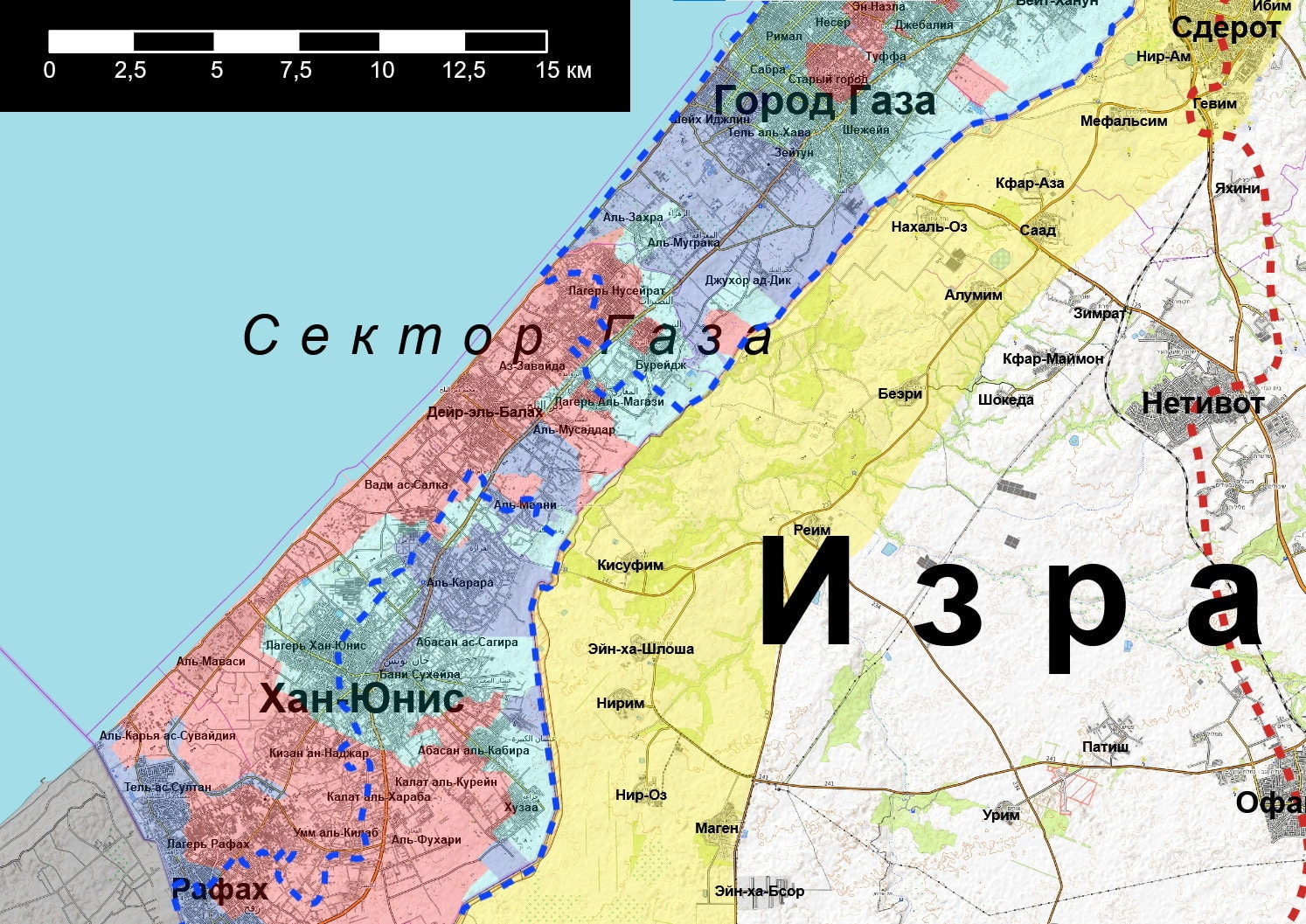 Зоны контроля на территории Газы по состоянию на конец сентября 2024 года. Красным отмечены территории под сохраняющимся контролем ХАМАС, синим – территории, контролируемые АО Израиля, а голубым – территории, занятые Израилем в прошлом, откуда израильские силы уже выведены. На сегодня эти территории представляют собой серую зону, на части которых восстановлен контроль ХАМАСа, в части из них сейчас нет ни палестинского населения, ни вооруженных отрядов.