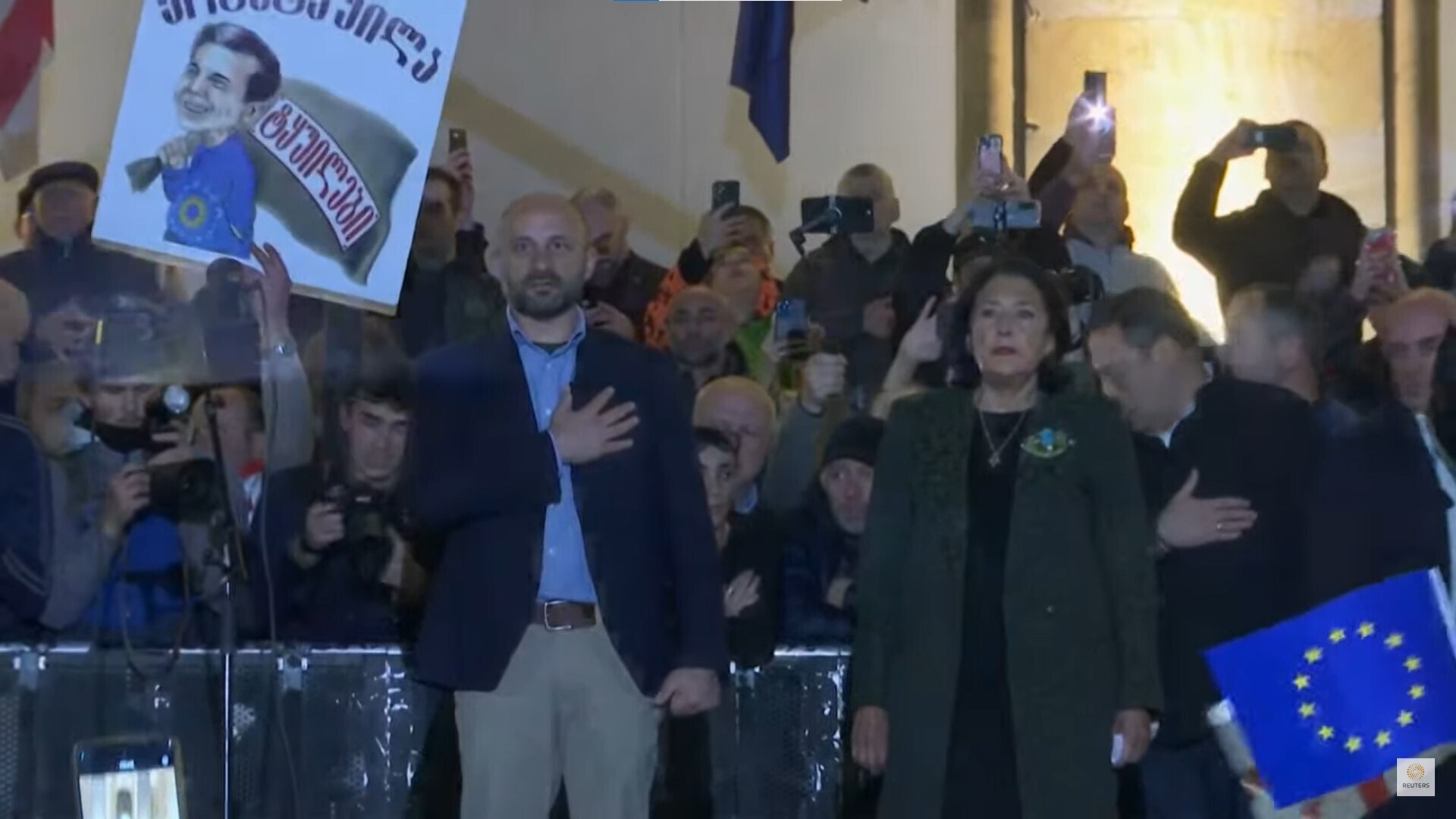 С опозданием на акцию пришла и президент Зурабишвили. Вновь, очень странно участие президента, являющегося представительской фигурой во внутриполитической борьбе, а по сути, против той партии, которая ее провела, и на стороне тех сил, которые ее саму 6 лет назад объявляли "кремлевской", хотя прошла она на эту позицию, по слухам, по просьбе Шарля Мишеля, которому внял Бидзина Иванишвили в 2018 году. И вот в 2023/4 гг. эта консерва была скрыта. Почему я говорю так однозначно?