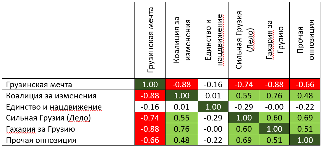 Как мы видим, в качестве наиболее явной оппозиции власти выступала «Коалиция за изменения», а также «Гахария за Грузию», но похожий паттерн фиксировался и у других субъектов за исключением «Национального движения», у которого паттерн голосования относительно больше похож на власть и минимально пересекается с другими субъектами. Кстати, даже не прозападная оппозиция, такая как «Лейбористы» и «Альянс патриотов», фиксировали выраженную отрицательную корреляцию с голосами за власть, что говорит о том, что характер голосования за власть отличался от голосования за оппозицию – и если в первом случае важную роль сыграли организационные факторы, то во втором – идеологические. Именно это сближает все оппозиционные партии вне зависимости от их политической ориентации.