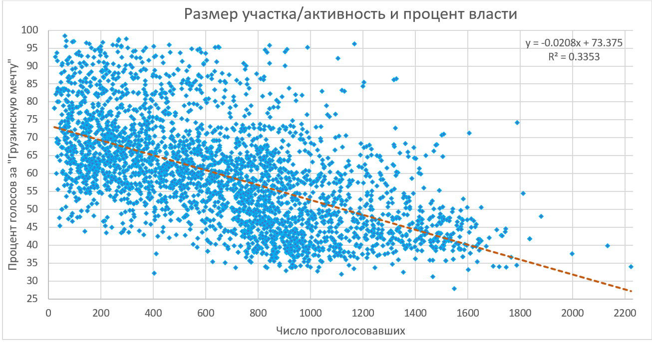 Вернемся к Таблице 2. Из нее есть несколько следствий. Во-первых, власть получила больший процент на малых и провинциальных участках, особенно в армянских и азербайджанских селах. На каждых дополнительных 100 проголосовавших, доля голосов, полученных партией власти, падала на 2% при корреляции в 0.58. Представим это графически.
