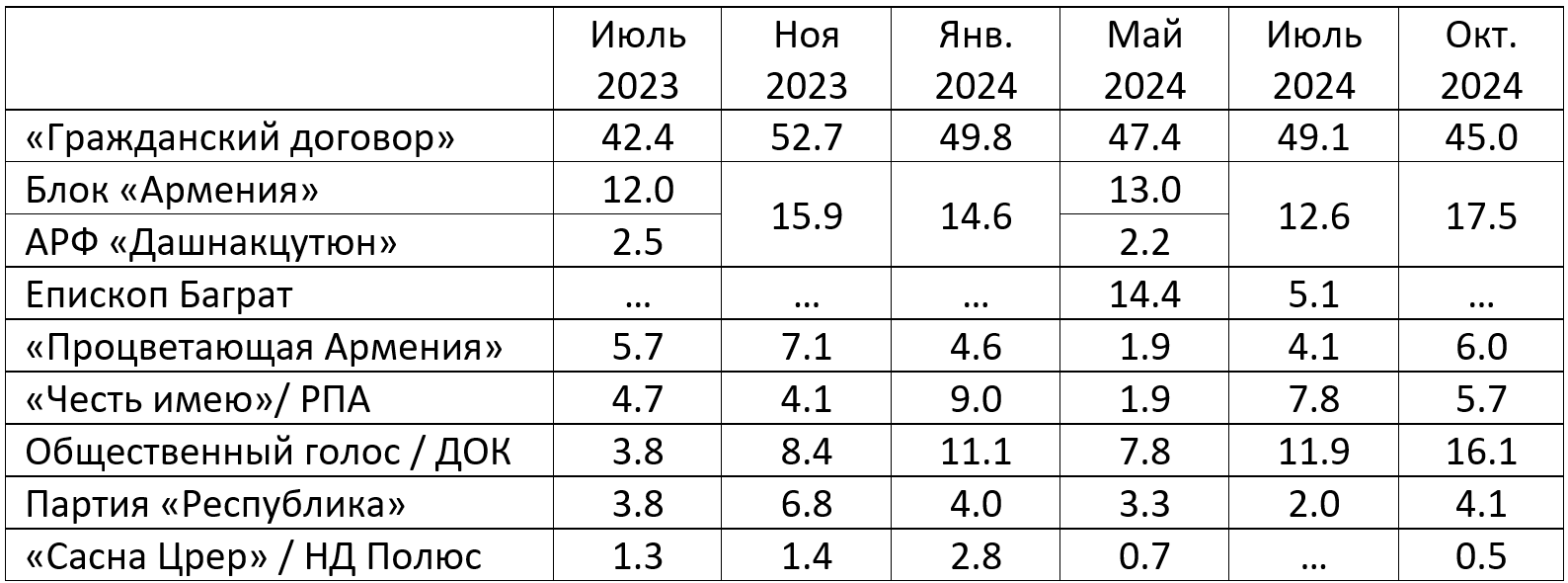 Рейтинг правящей партии осенью продолжал восстановление к уровню начала года, тогда как епископа Баграта избиратели перестали воспринимать в качестве реального политического лидера, а его потенциальные голоса перераспределились между партией «ДОК» и блоком «Армения». Сократилось количество неопределившихся избирателей. Рейтинг политических партий (при условии, что выборы прошли бы в ближайшее воскресенье), выглядит так:
