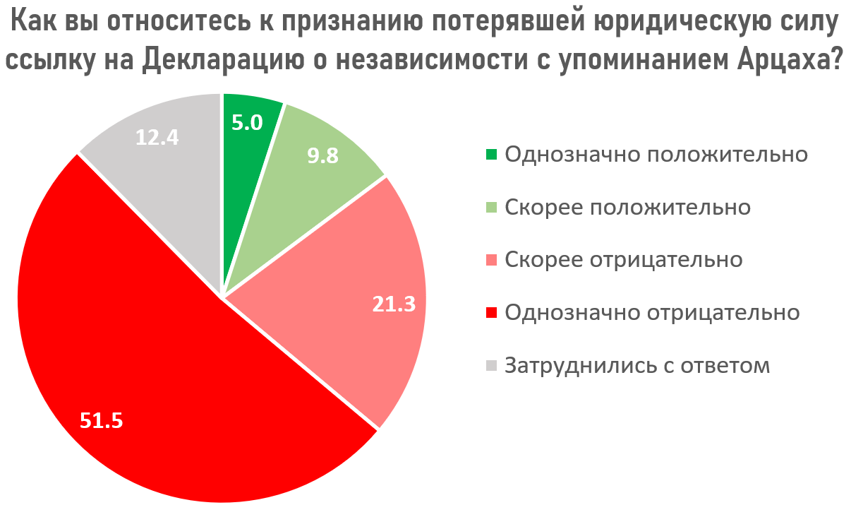 Некоторые юристы и эксперты это называли государственным переворотом, другие – отменой фундамента государства, но для Пашиняна это было всего лишь наиболее безболезненным способом удовлетворить требования Алиева, чтобы приблизиться к заключению «мирного договора». По сути, речь идет в первую очередь об отказе от упоминания Арцаха, против чего выступили три четверти опрошенных. Сторонниками этого решения является менее 15% опрошенных.