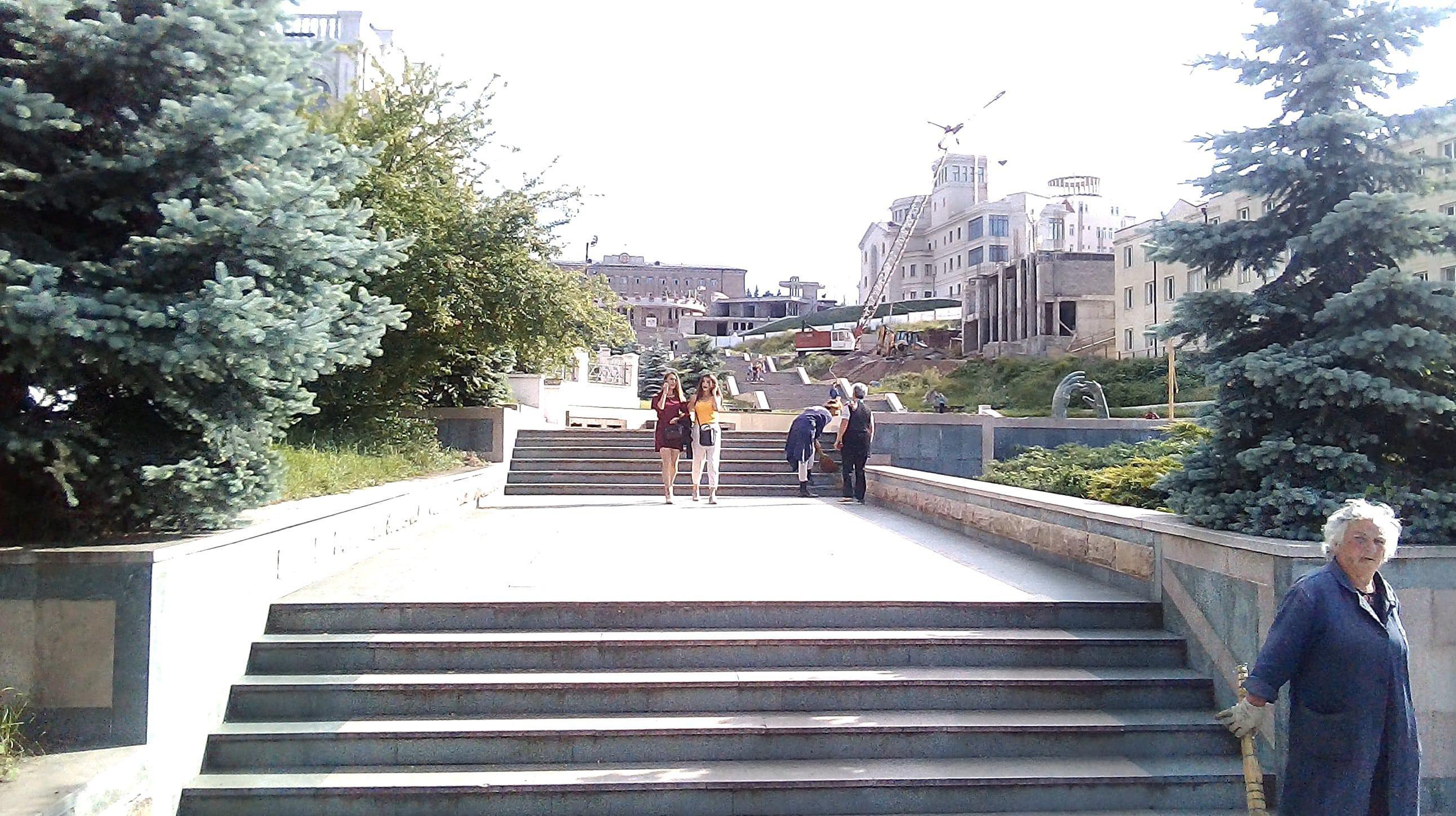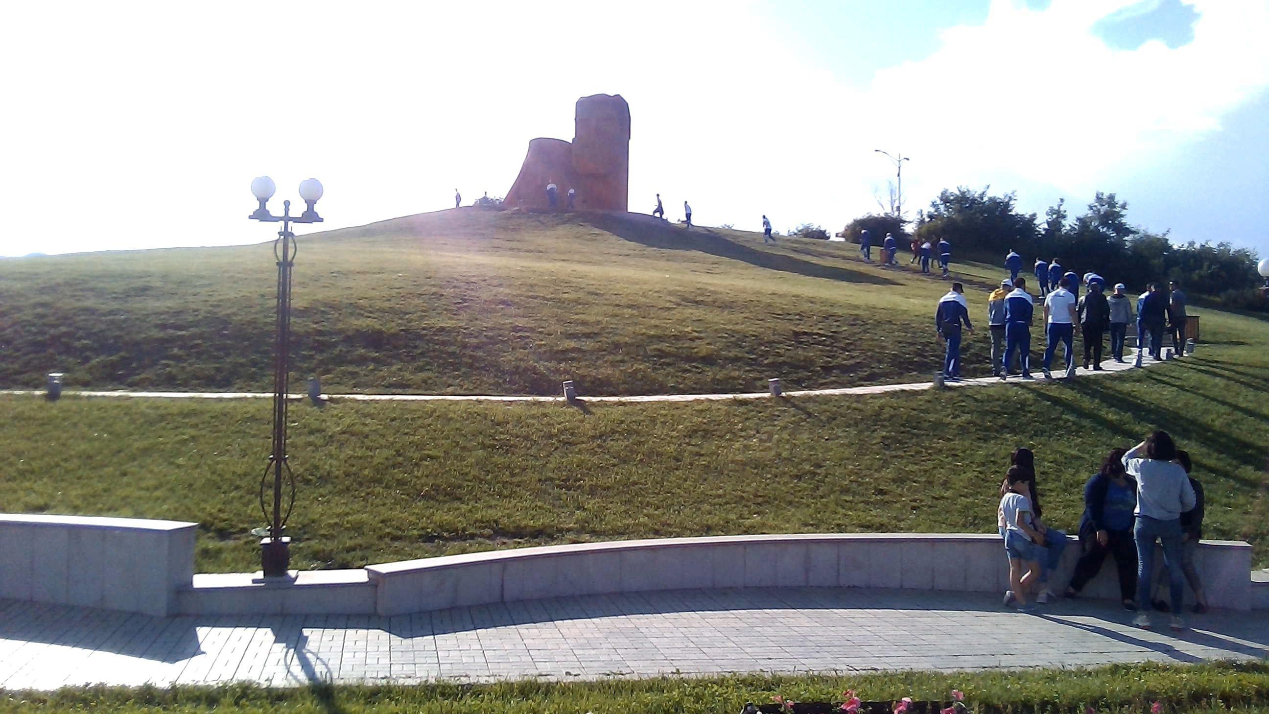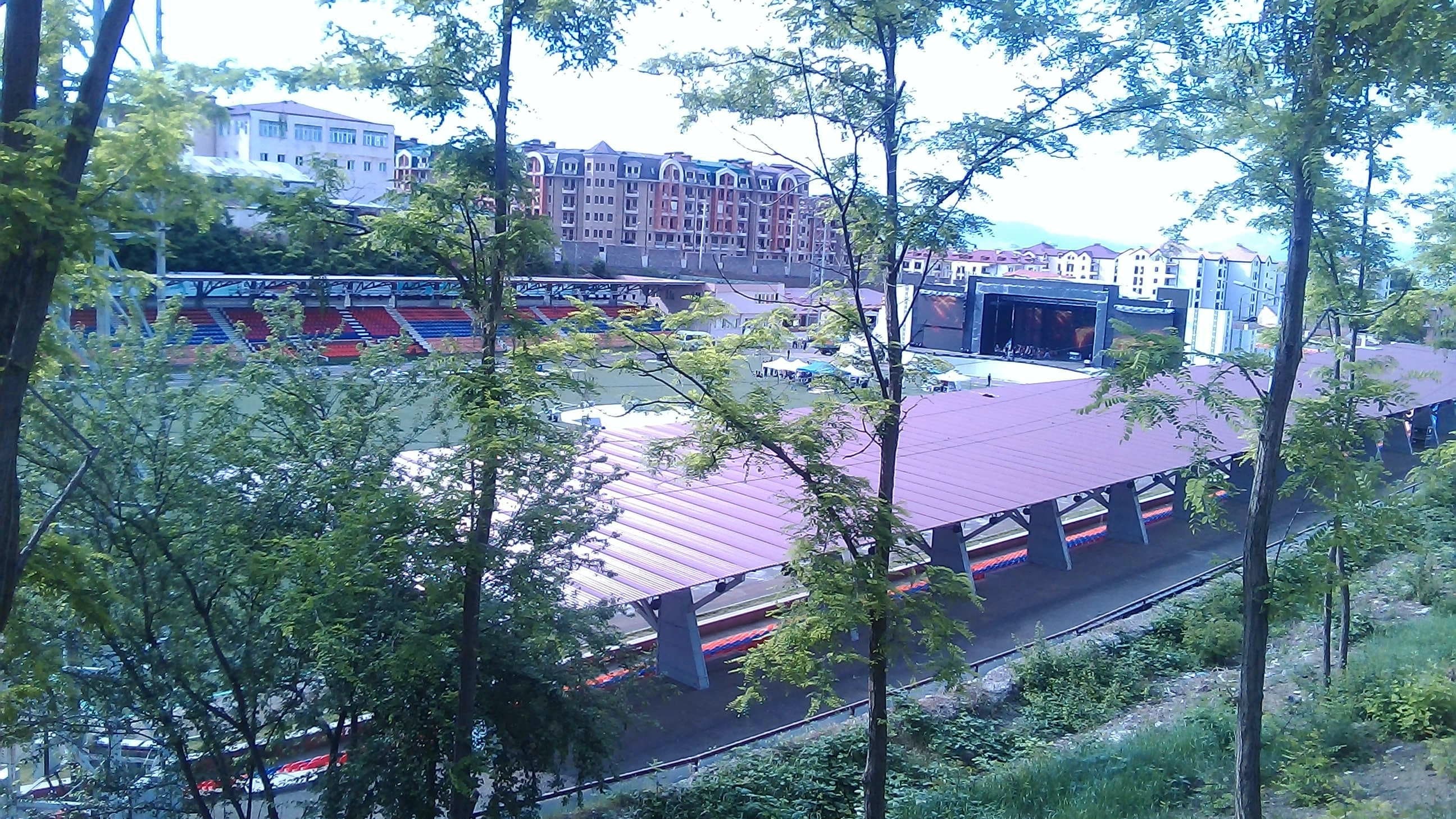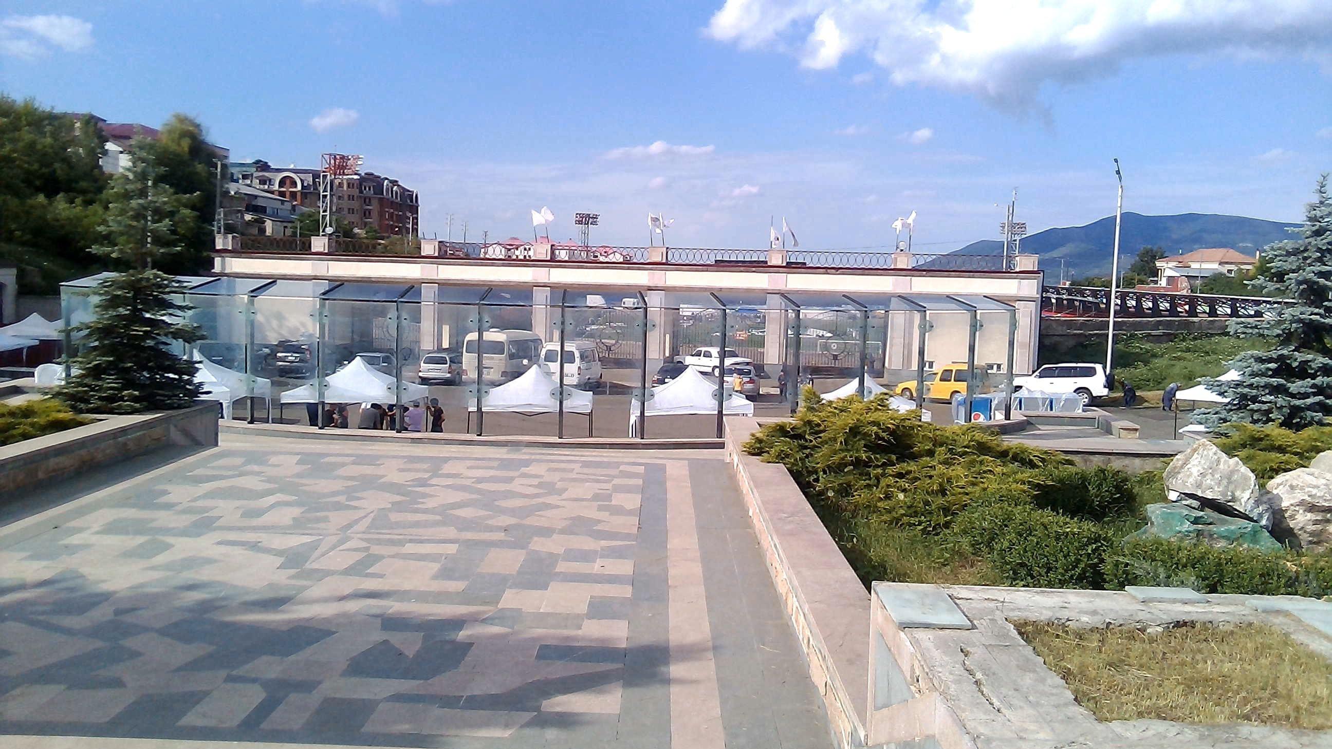 На недавно поставленной прямо за полем сцене танцоры репетируют "Танец с саблями", под усиленную динамиками музыку Арама Хачатряна.