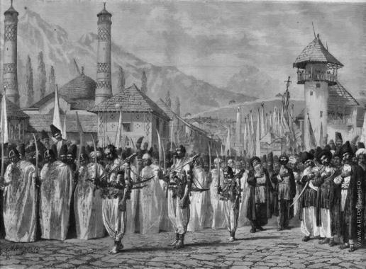«Смешавшись с толпой народа, собравшегося на площади, я вместе с нею жадно ждал начала представления, долженствовавшего изобразить наглядным образом тот дикий фанатизм и варварство, которые уже немыслимы в наше время. Отдаленные и продолжительные крики: «Гуссейн! Гуссейн!» возвестили приближение процессии, появившейся в том самом порядке, в котором она неизменно появляется каждый год. Впереди показались, в числе нескольких сот человек, так называемые самоистязатели, или изрубленные. Они шли, выстроившись в два ряда, и несли в правой руке саблю, обращенную острием к лицу.
