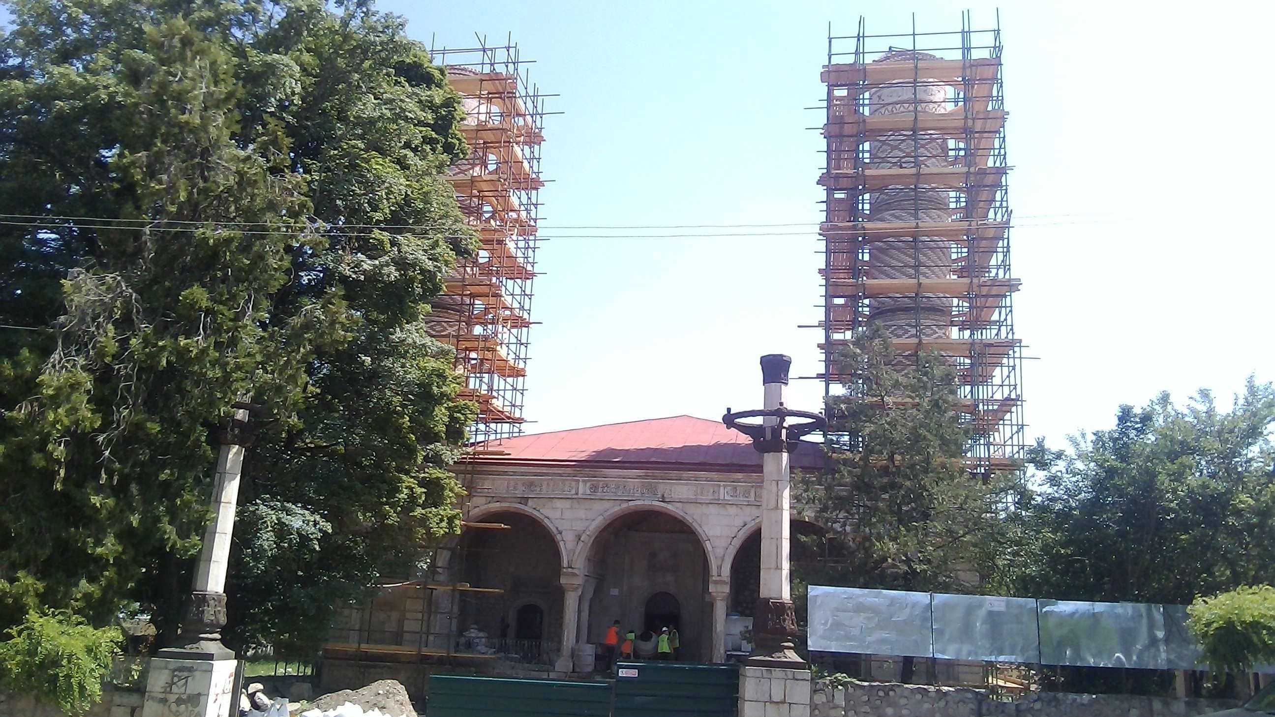 Минареты “одеты” в строительные леса. Хотя, как и тогда, строят и работают армяне. Не бесплатно, конечно же.