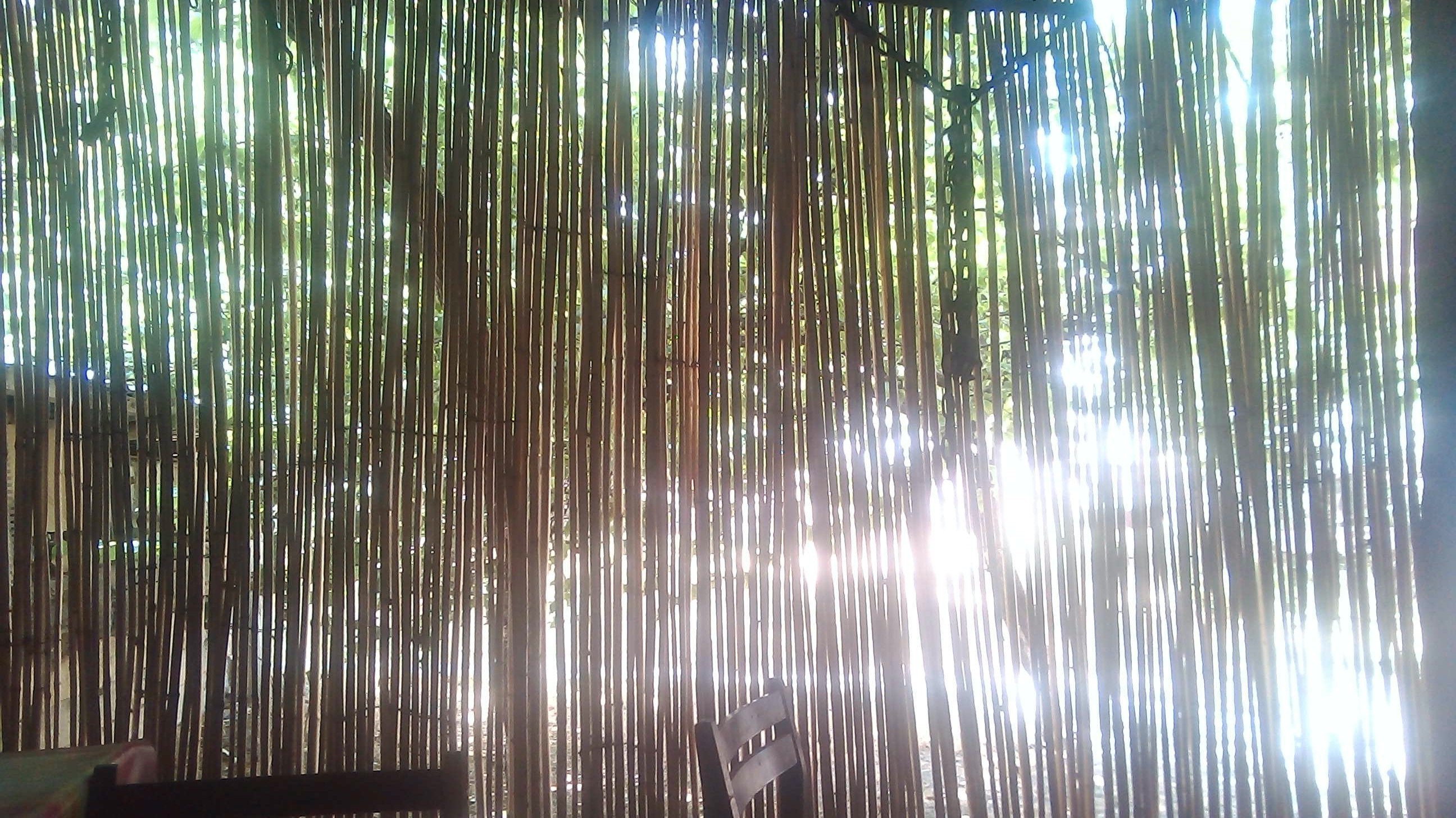 Беседка у меня лесная, из тростника, дерева и камней, журнальный столик, подаренный дедом и сделанный его руками и солдатская лежанка.
