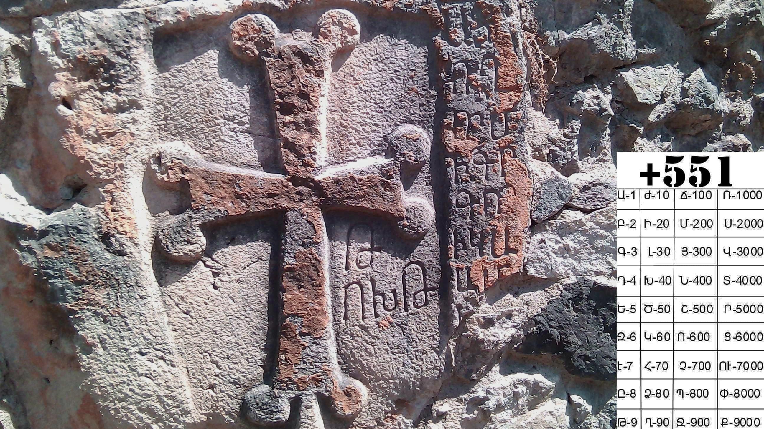 Первая буква сверху это буква Թ , она означает тив, т. е. год. Снизу еще три буквы Ո, Խ, Թ . Ո - смотрим в таблице, это 600 (не путать с Ռ) , Խ - 40, Թ - 9, плюсуем все 600+40+9 =649. К этой цифре надо приплюсовать еще 551, (специально жирным выделил на шпаргалке сверху, чтобы не забыть), это разница между летоисчислениями , т. е. 649+551=1200 год.