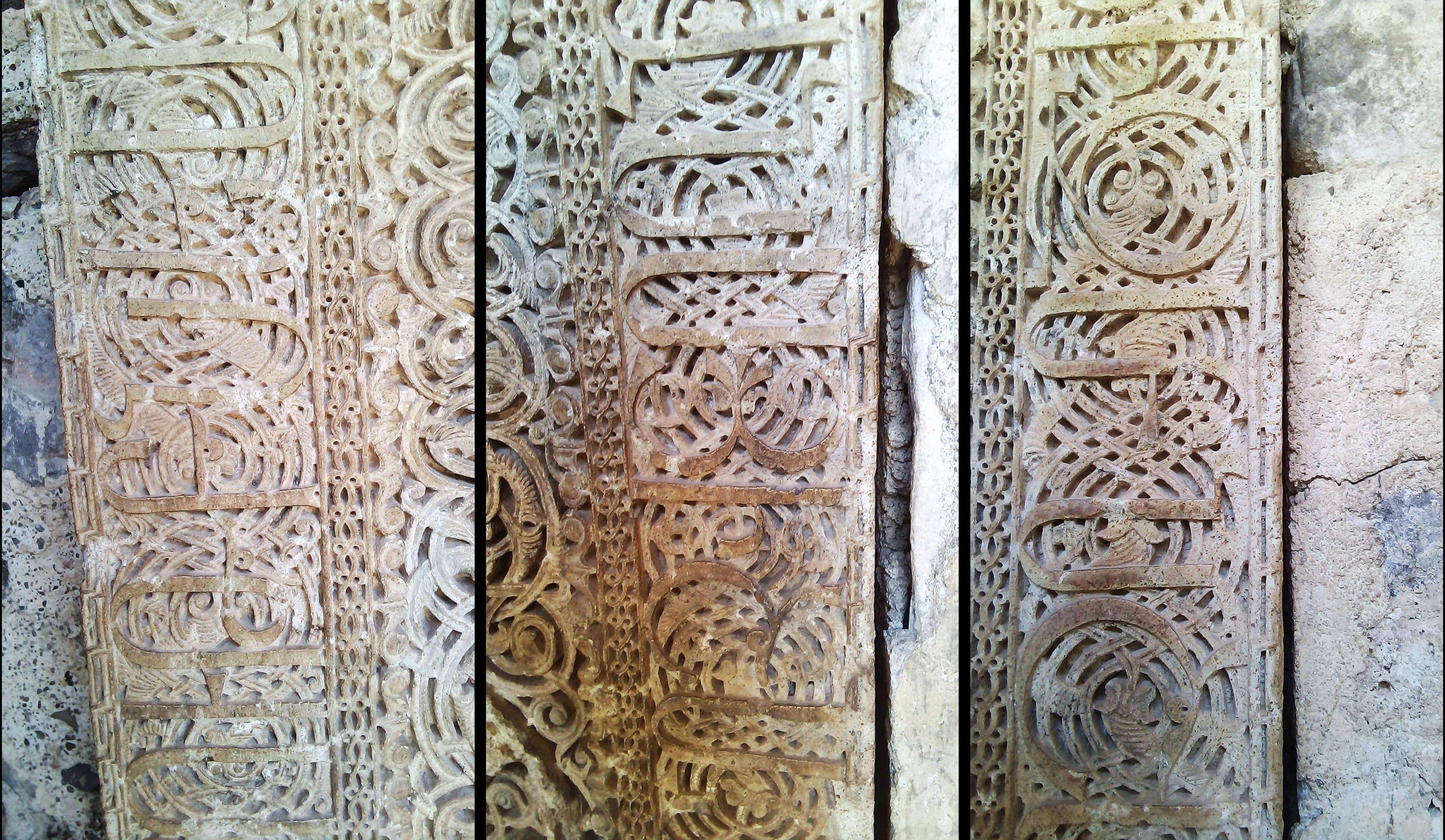Дальше мы видим в стене старинный Хачкар. Насколько он старинный? В староармянском, вместо цифр, год записывали буквами. Вот эта надпись под правым крылом креста. Попробуем ее прочитать. Для этого нам нужна шпаргалка, я ее пристроил справа для наглядности.