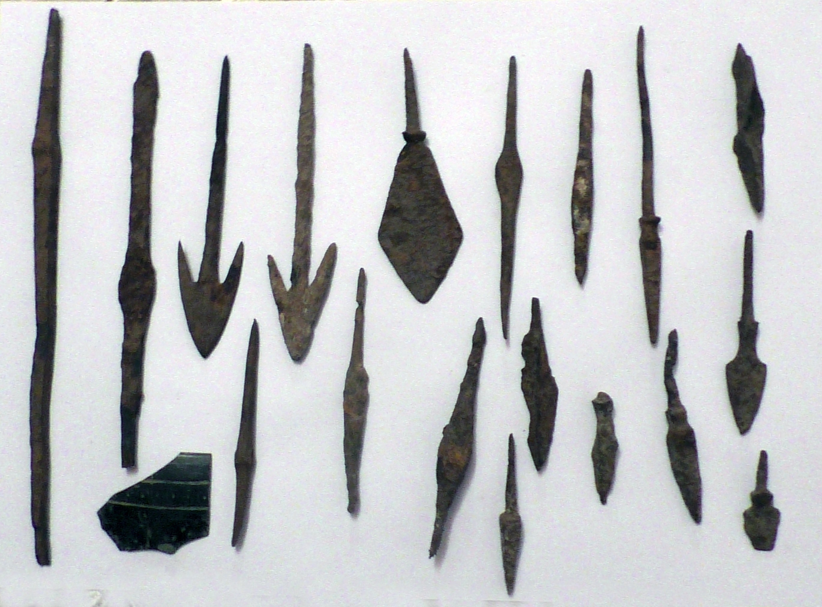 Наконечник копья очень интересен. Вправо от "черепа" (что за железный "черепок" - я не знаю, деталь от чего-то) бронзовый наконечник, он у Эрика единственный бронзовый, остальные наконечники железные.