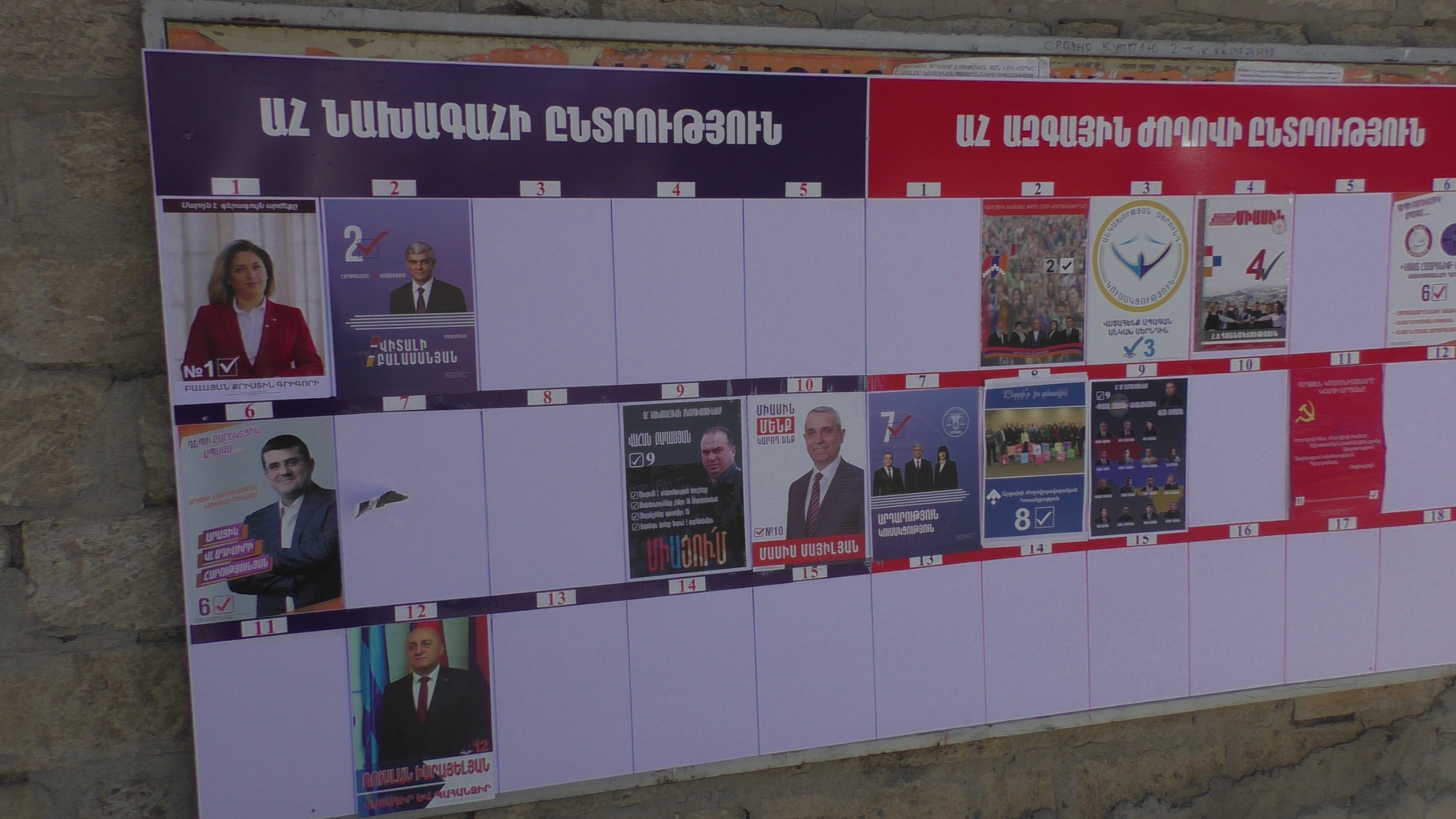 Больше всех денег у Араика Арутюняна, соответственно его плакат самый большой. Это рядом с вокзалом. Наши таксисты в своем большинстве за него, верят, что он станет президентом и улучшит жизнь всех жителей Арцаха. Интересно, если вдруг станет президентом, вспомнит ли о таксистах?