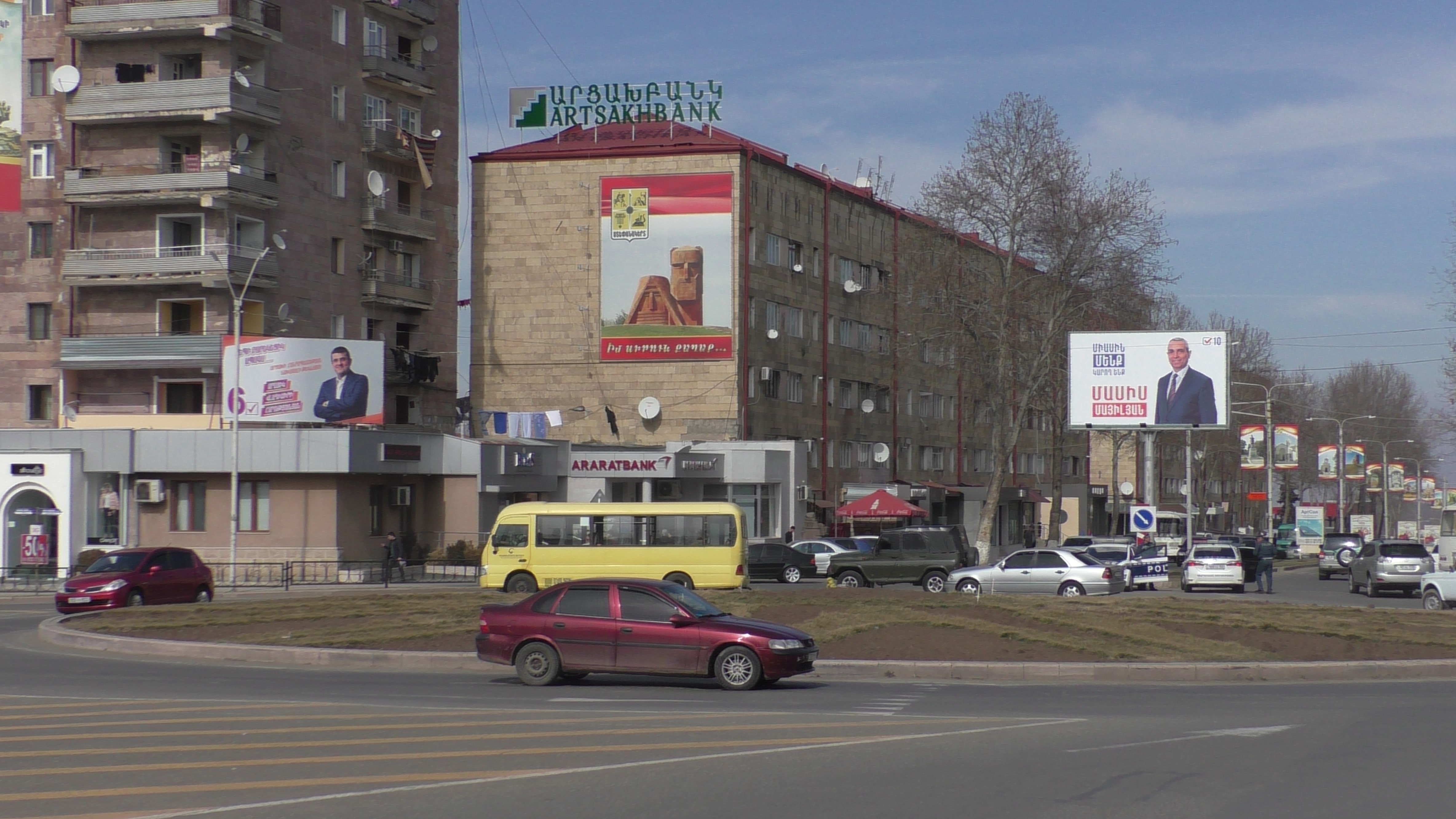Кольцевая... и тут соседство плакатов, а посередине наш знаменитый памятник "Дед да Баба", что тоже символично. Вот только "Арцахбанк" у нас выше всех, как туз на королями...