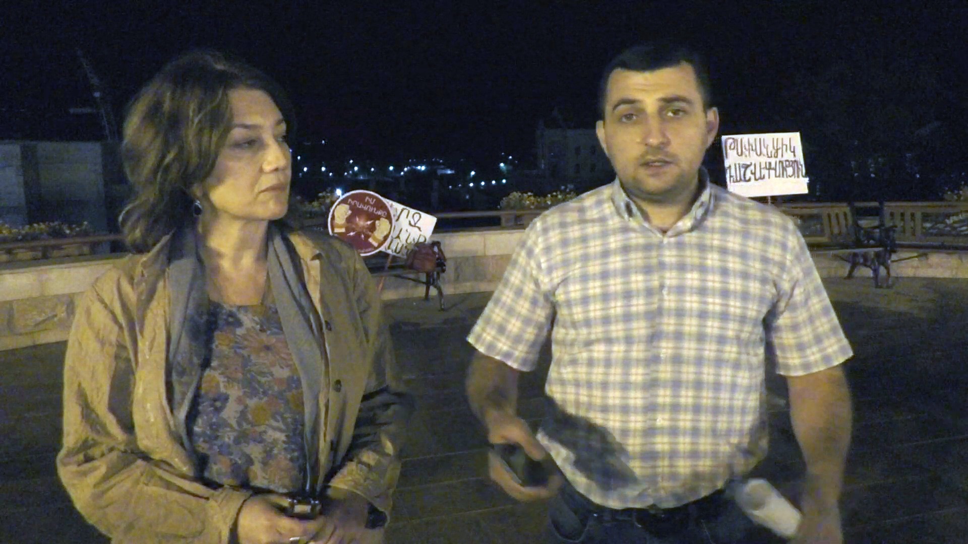 Площадь полили и акция продолжилась. Подошел к ним и попросил рассказать, в чем состоят их требования. Артур и Нонна любезно согласились ответить на все мои вопросы, за что им большое спасибо. Суть требований понятна, она отразилась в их плакате - "Прозрачный отчет" от государства.