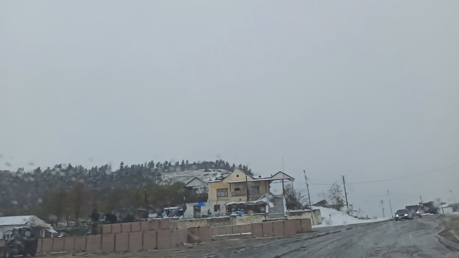 До Шуши снег таял, не задерживался на дороге, но чем выше в горы, тем больше снега. Местами видны и ямы от взрывов. Увидел снегоочистительную машину, но одна машина явно не справлялась со снегопадом.